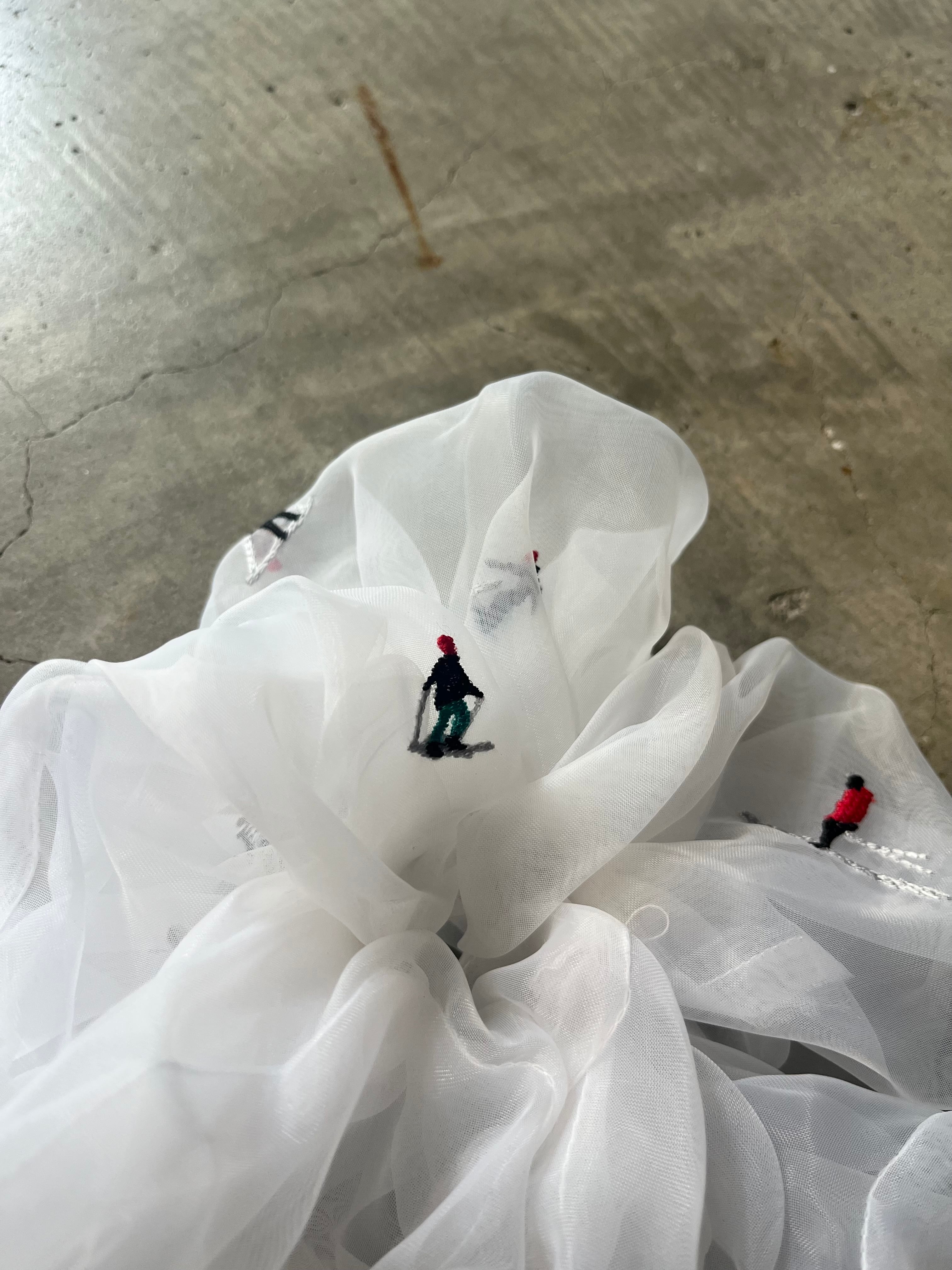 真っ白のオーガンジーを雪山に見立てて、たくさんのスキーヤーが滑り降りているデザインのシュ