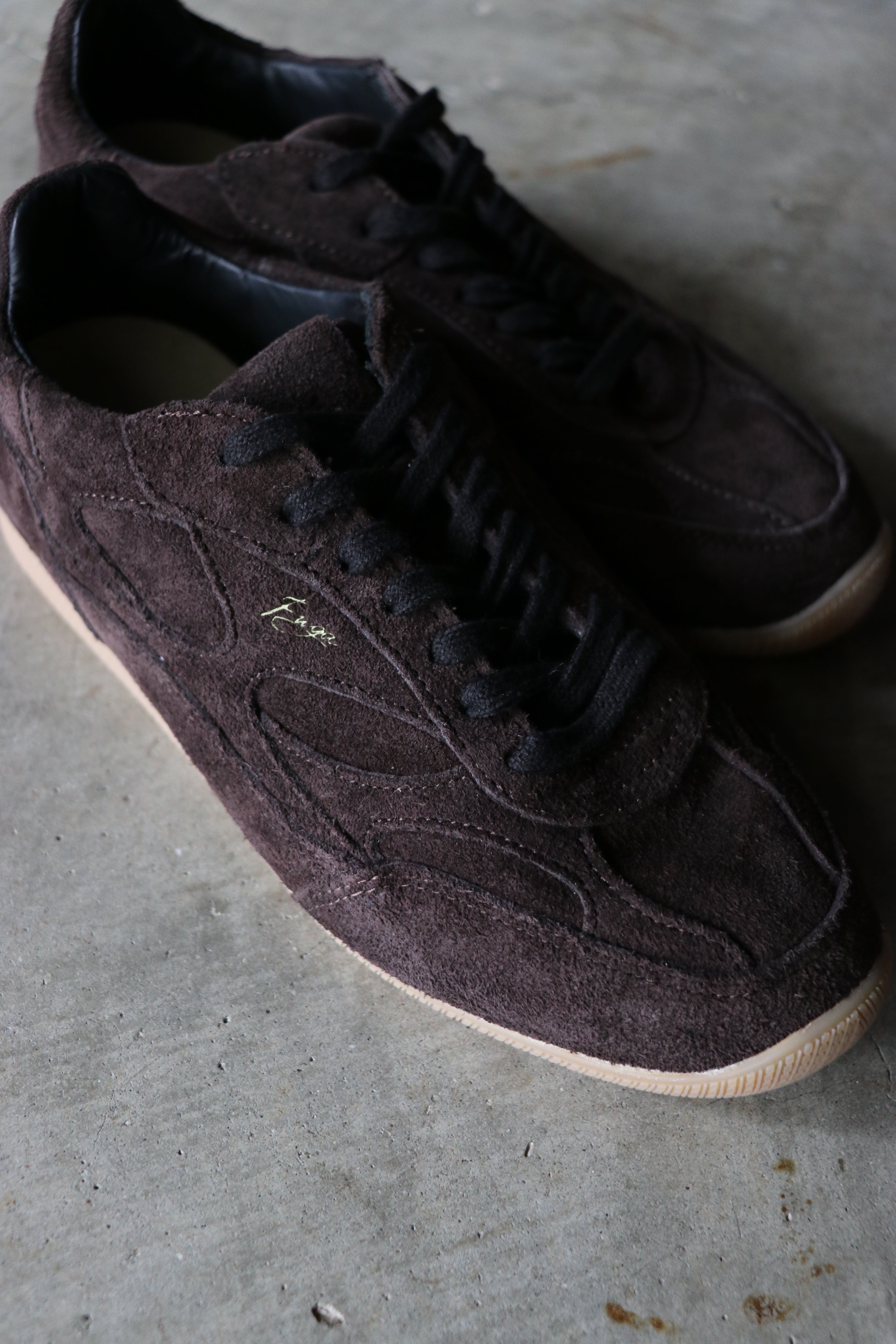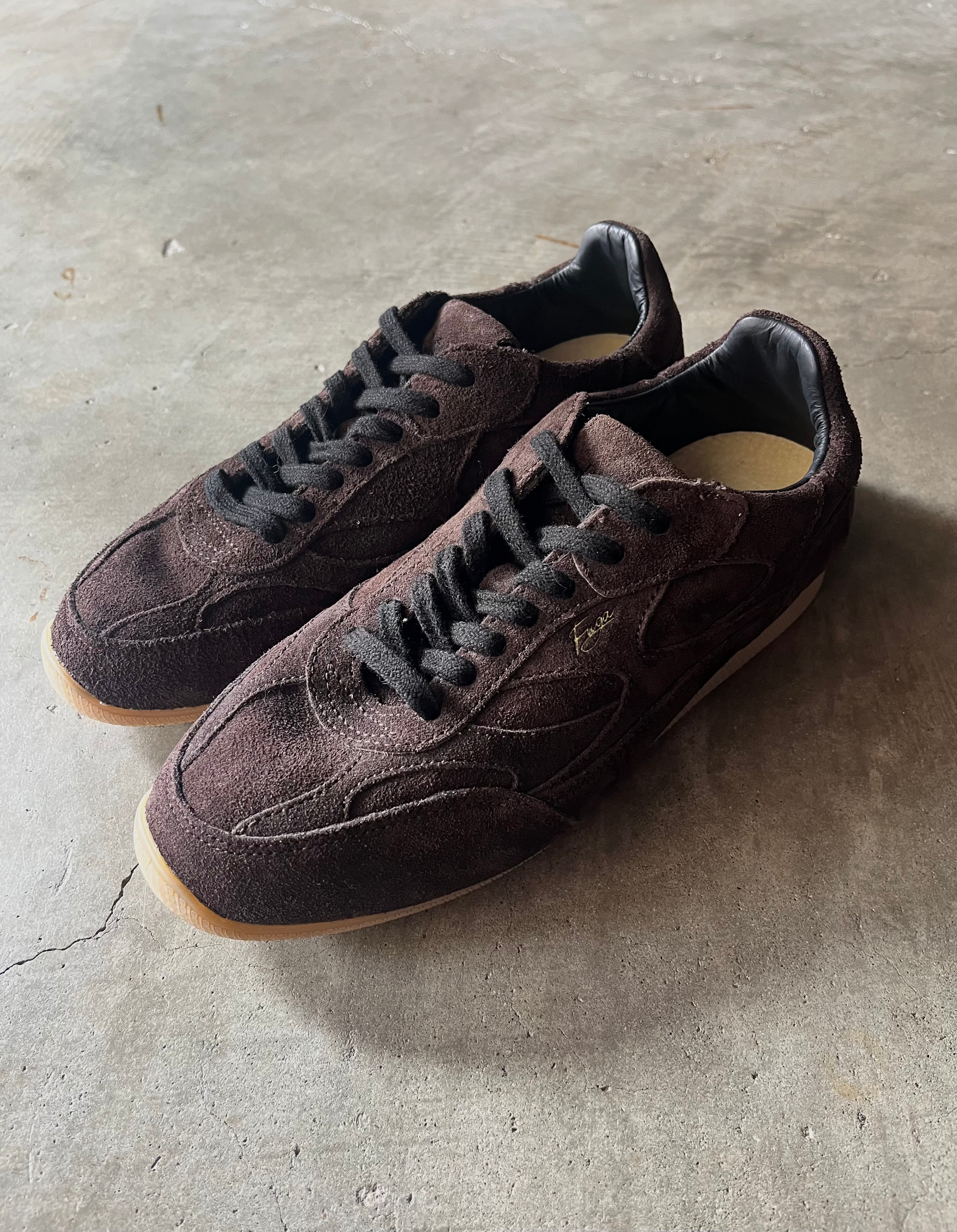 スエード調の起毛素材で仕上げたワントーンのブラウンアッパークッション性のあるライニングと軽量ガムソールで一日中快適同色ステッチでミニマル&クリーン、さりげないサイドロゴガムカラーのアウトソールが上品さとレトロ感をプラスブラックシューレースで足元を引き締め、幅広いコーデに対応デニムからセットアップまで、きれいめカジュアルの“外し”にも最適。