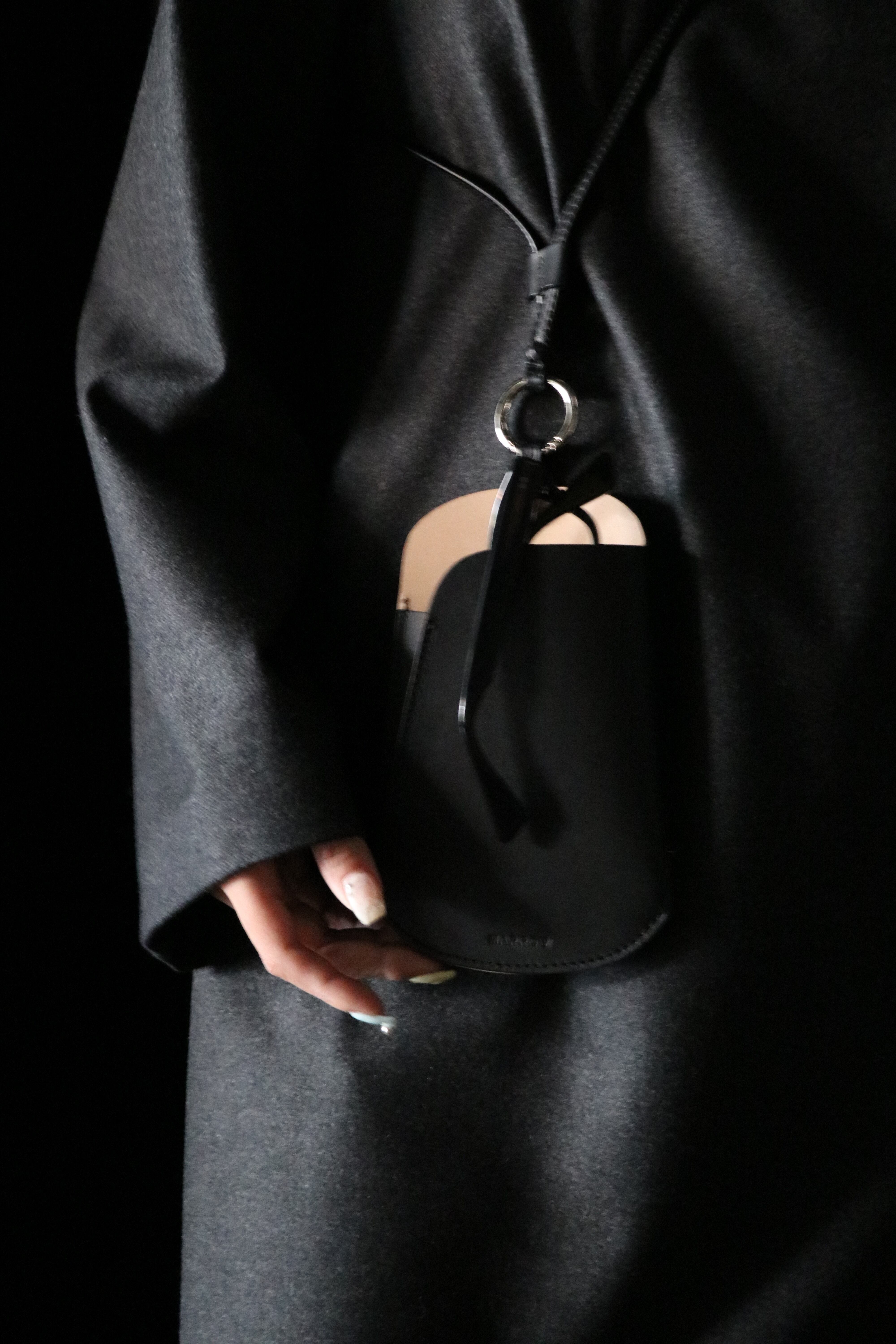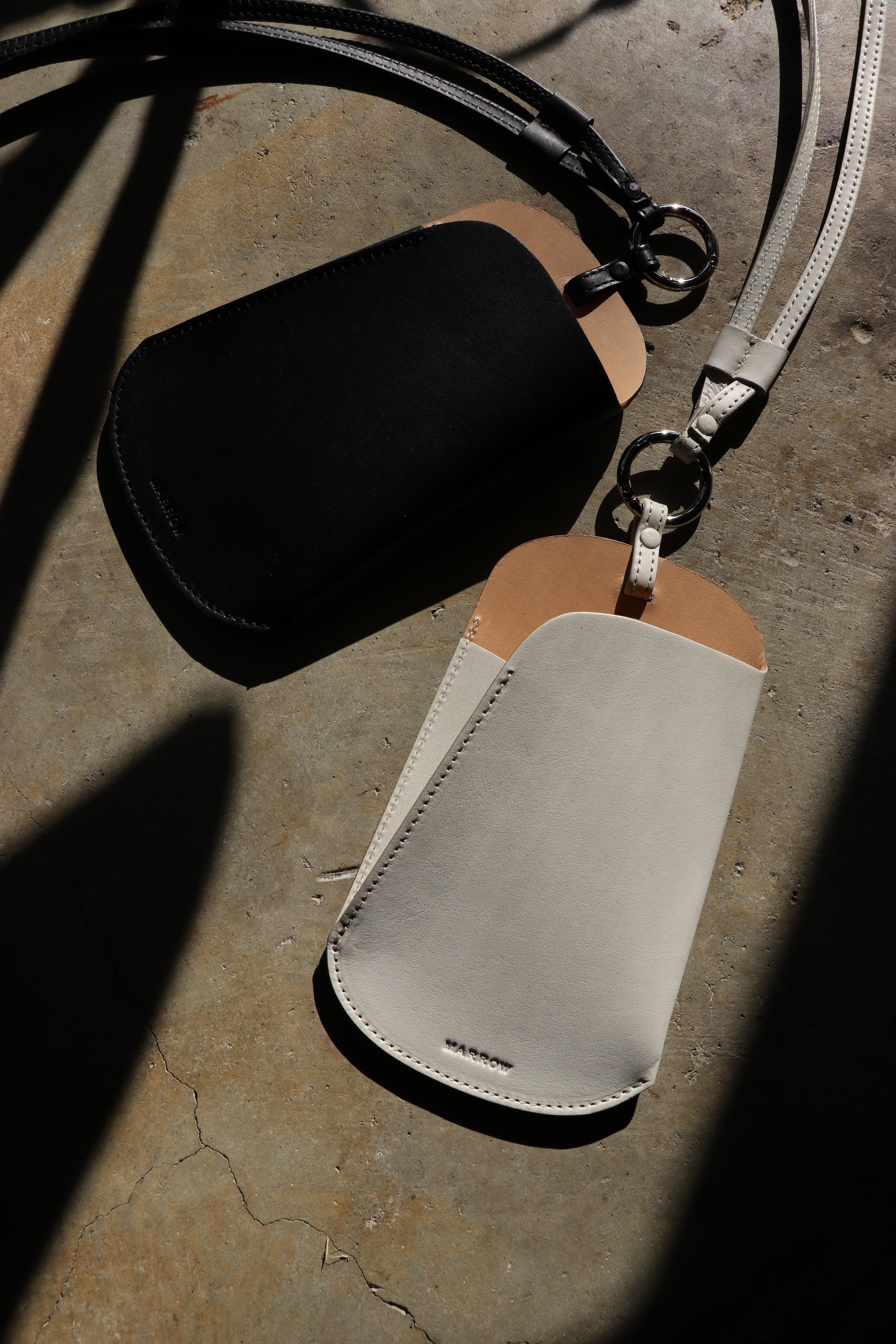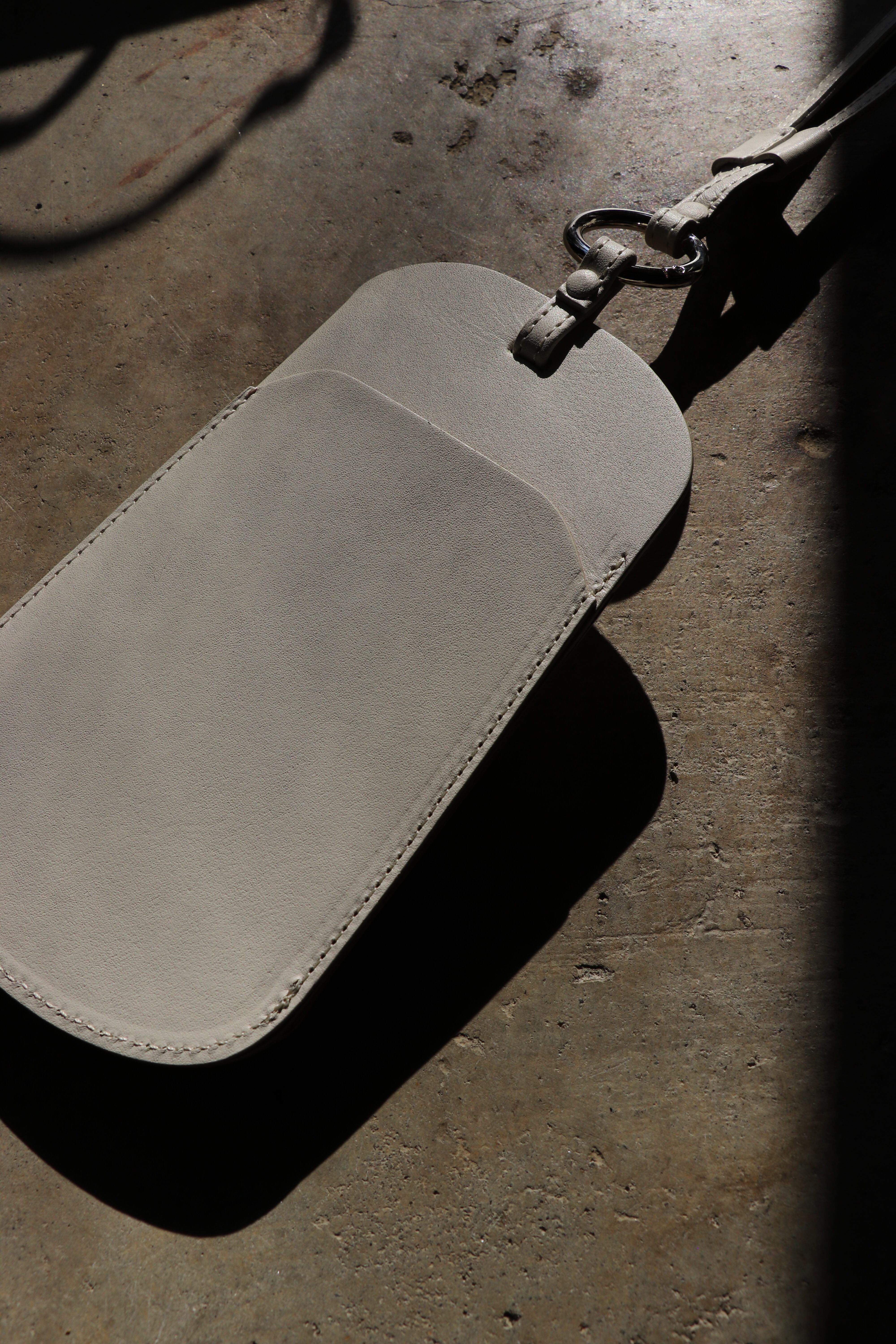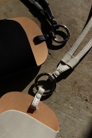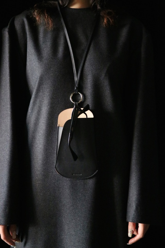 シーズンを問わず携帯することが多くなったサングラスやメガネを入れるショルダー。定番の財布などと同様に、薄く漉いたスムース革とヌメ革を貼り合わせ1枚仕立てで作られている。メガネだけに限らず携帯も十分に入れられるサイズとなっており、背中側にもポケットが付くのでカードなどが収納でき便利に使うことができる。本体と紐を繋ぐ金具は開閉可能となっているので、チャームなどを通したり、またこの商品自体をバッグの持ち手などに下げて使用することもできる。