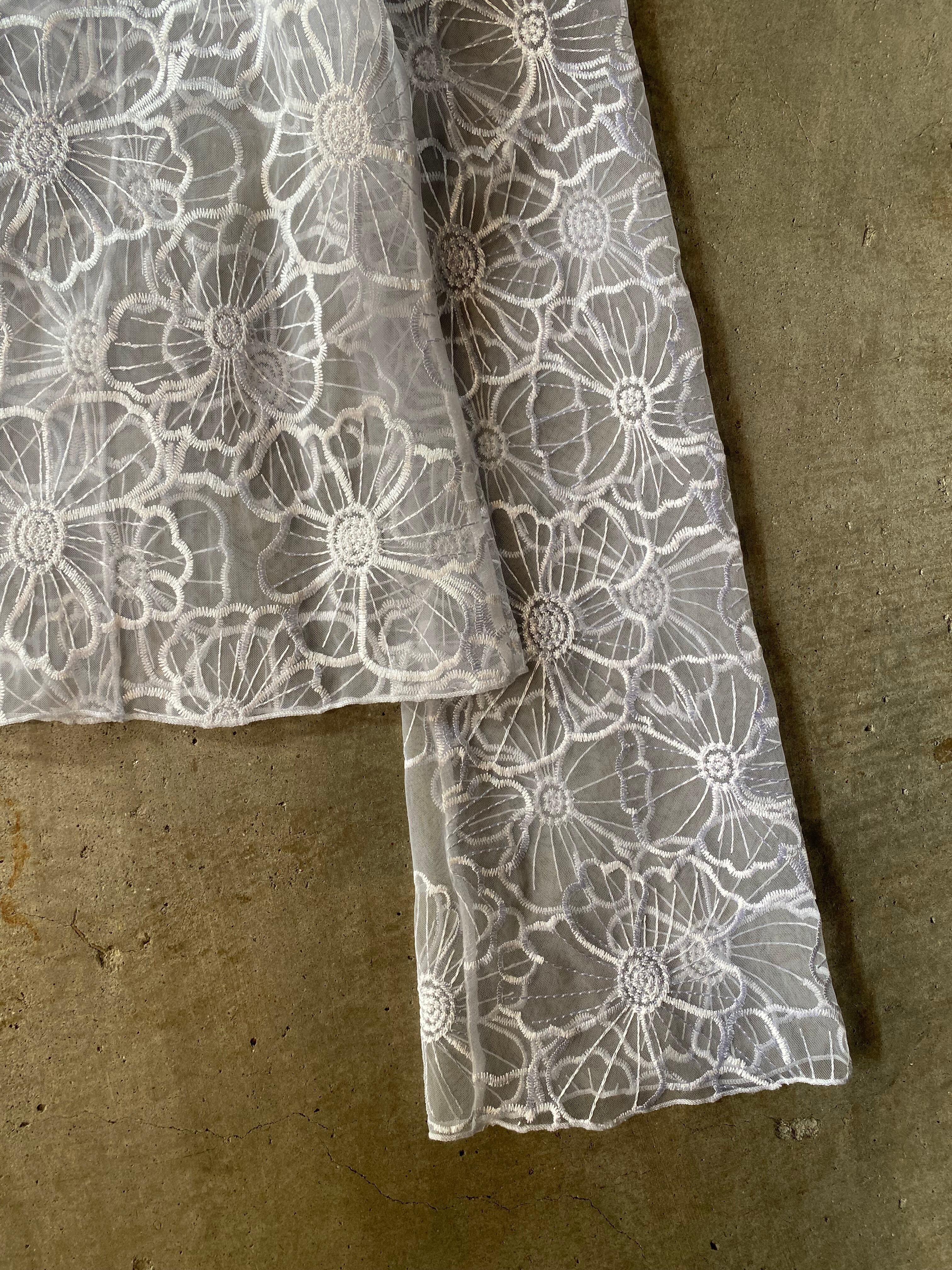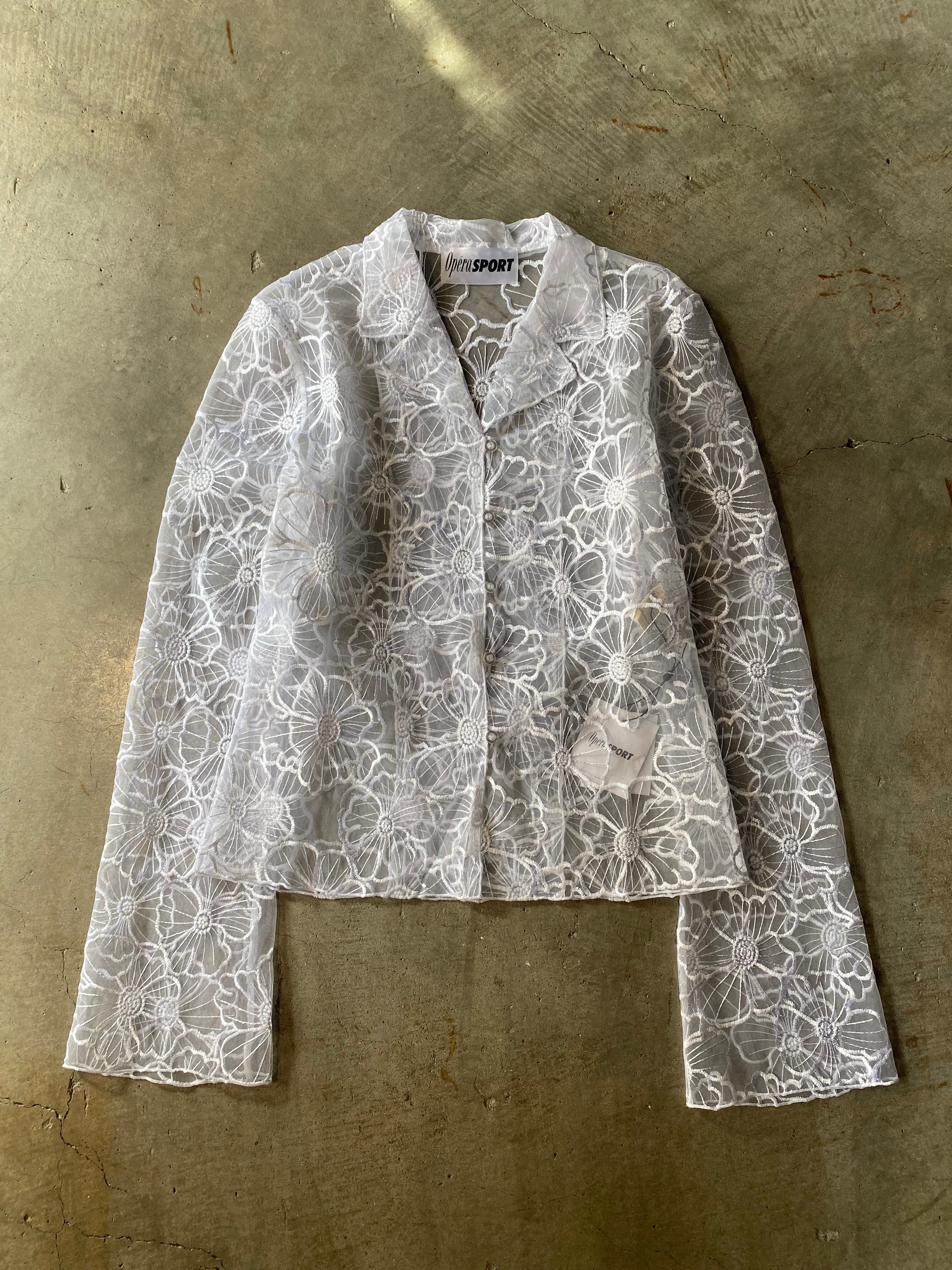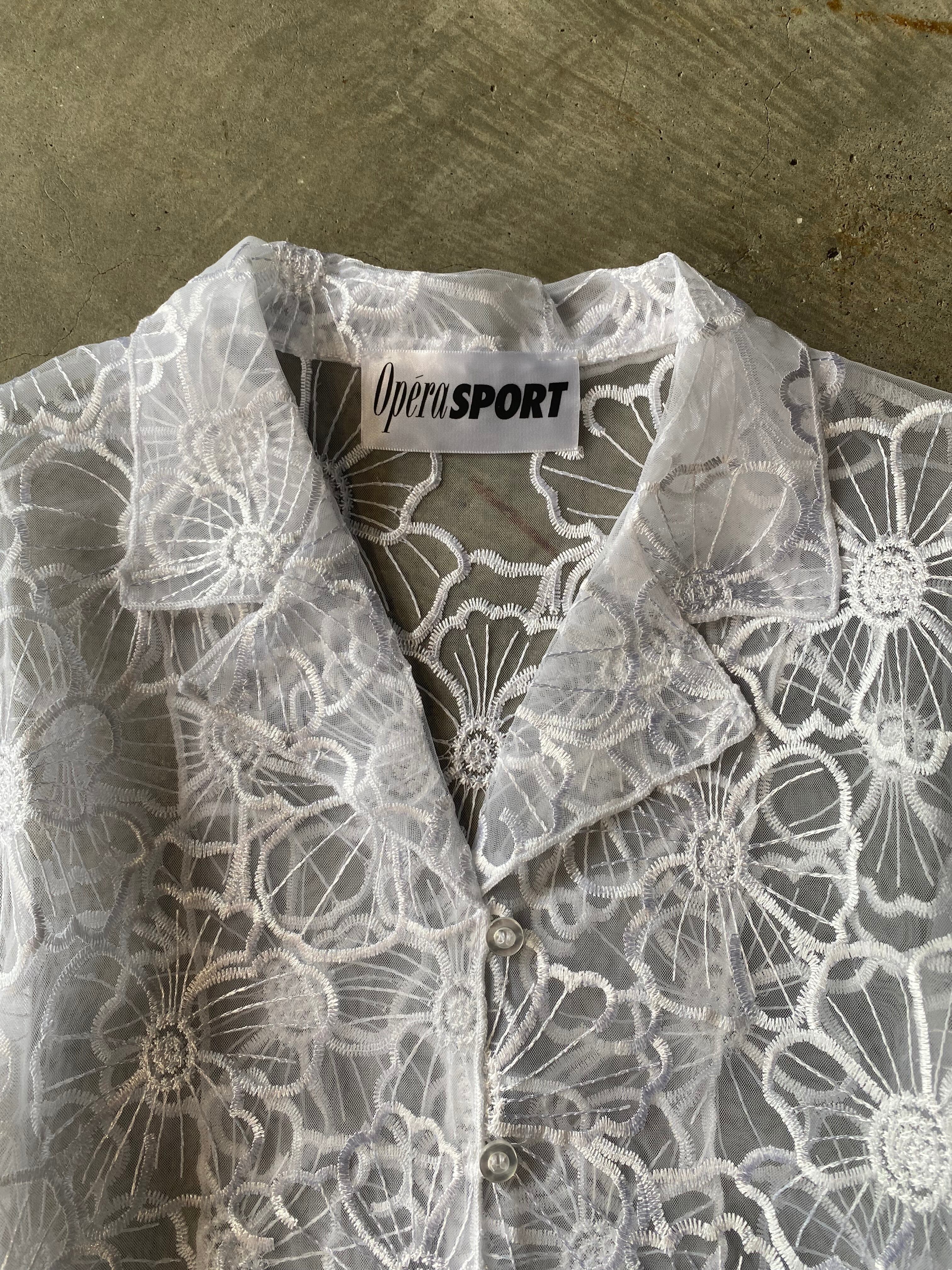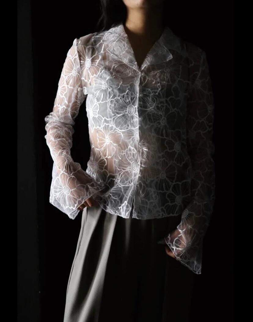 美しいレースの白いフローラシャツは、100%リサイクルポリエステルで作られています。