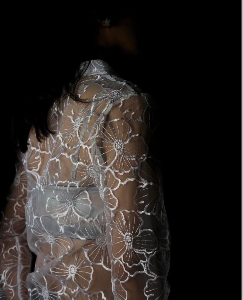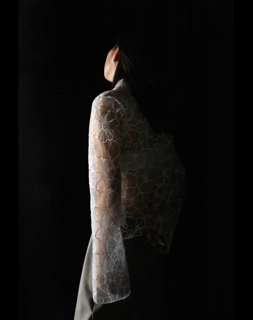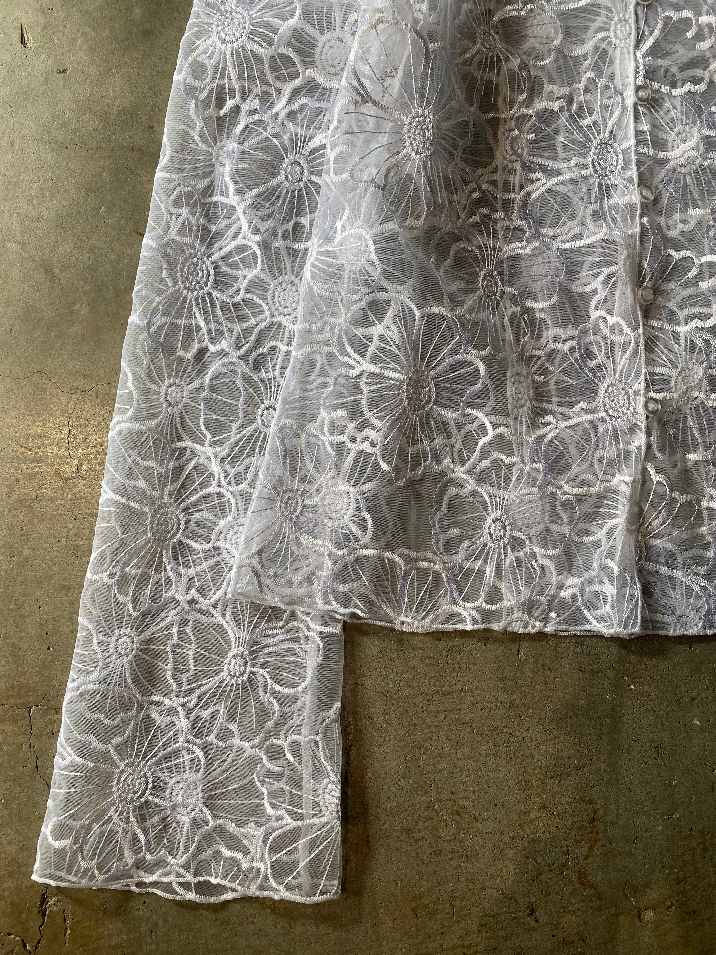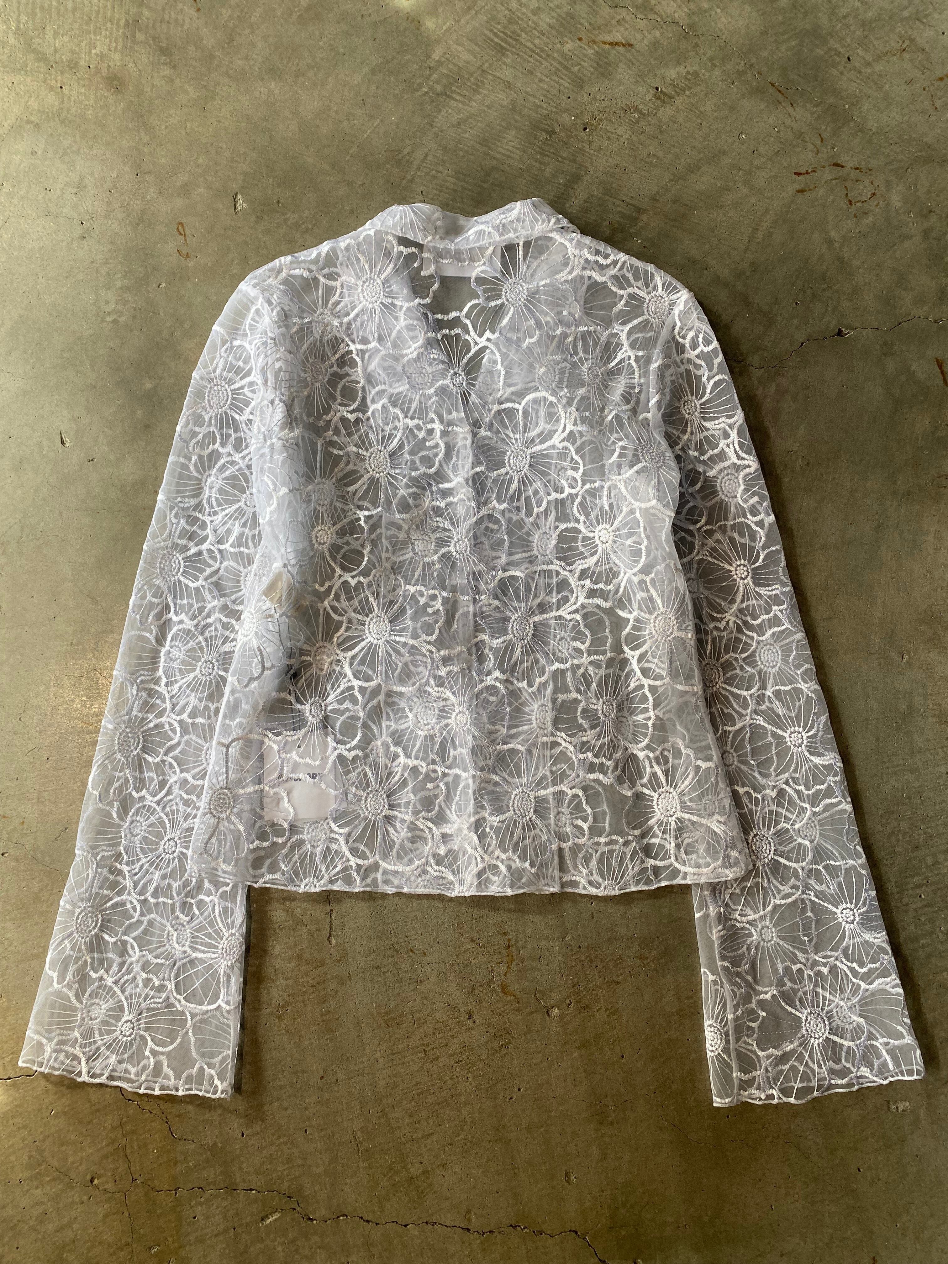 美しいレースの白いフローラシャツは、100%リサイクルポリエステルで作られています。