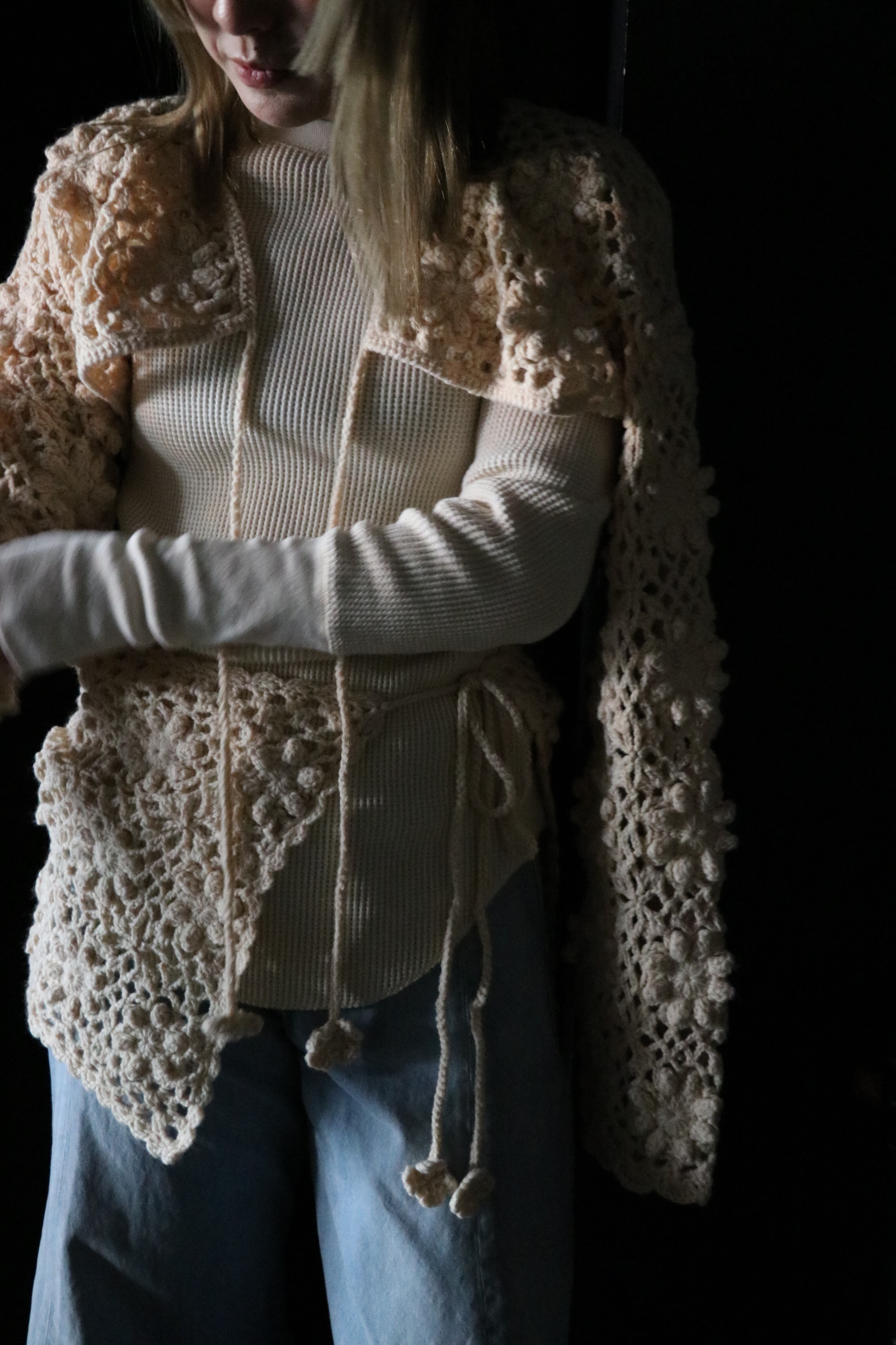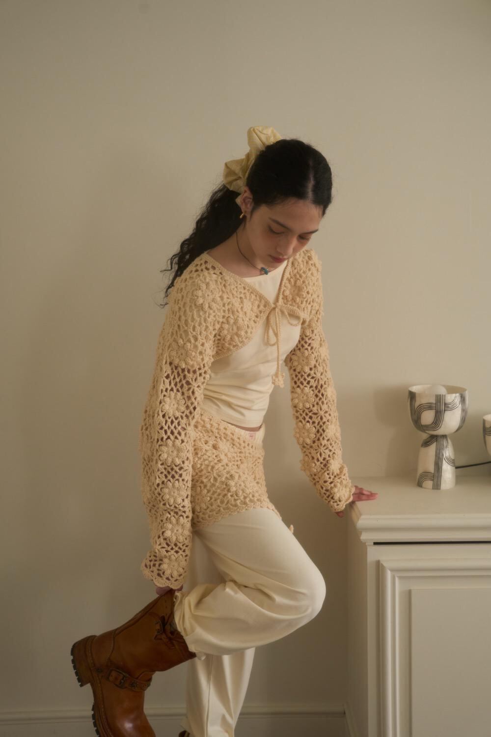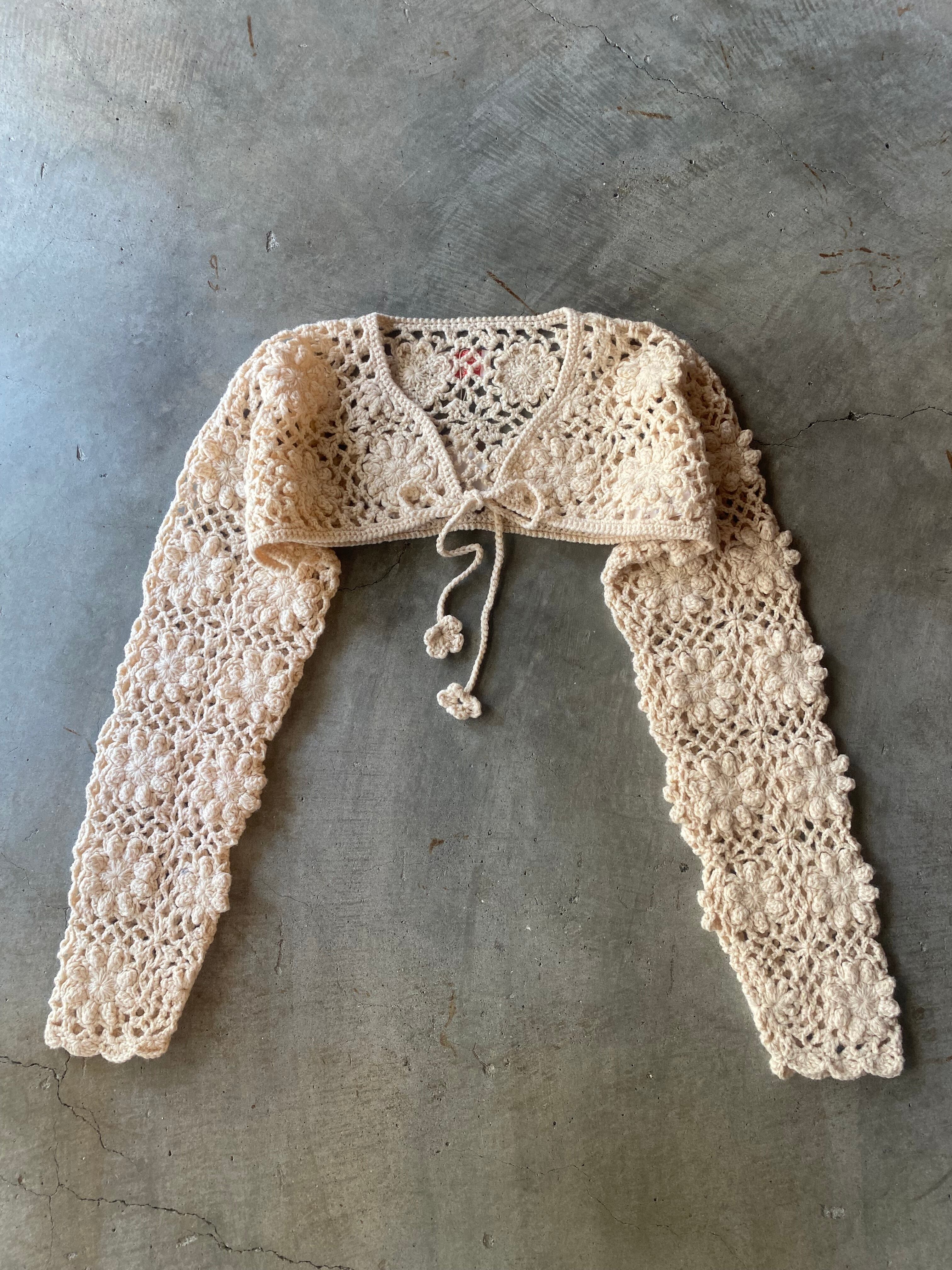 この手作りのマイクロボレロカーディガンは、ビーチウェアのカバーアップスタイリングアイテムとして推奨されます。