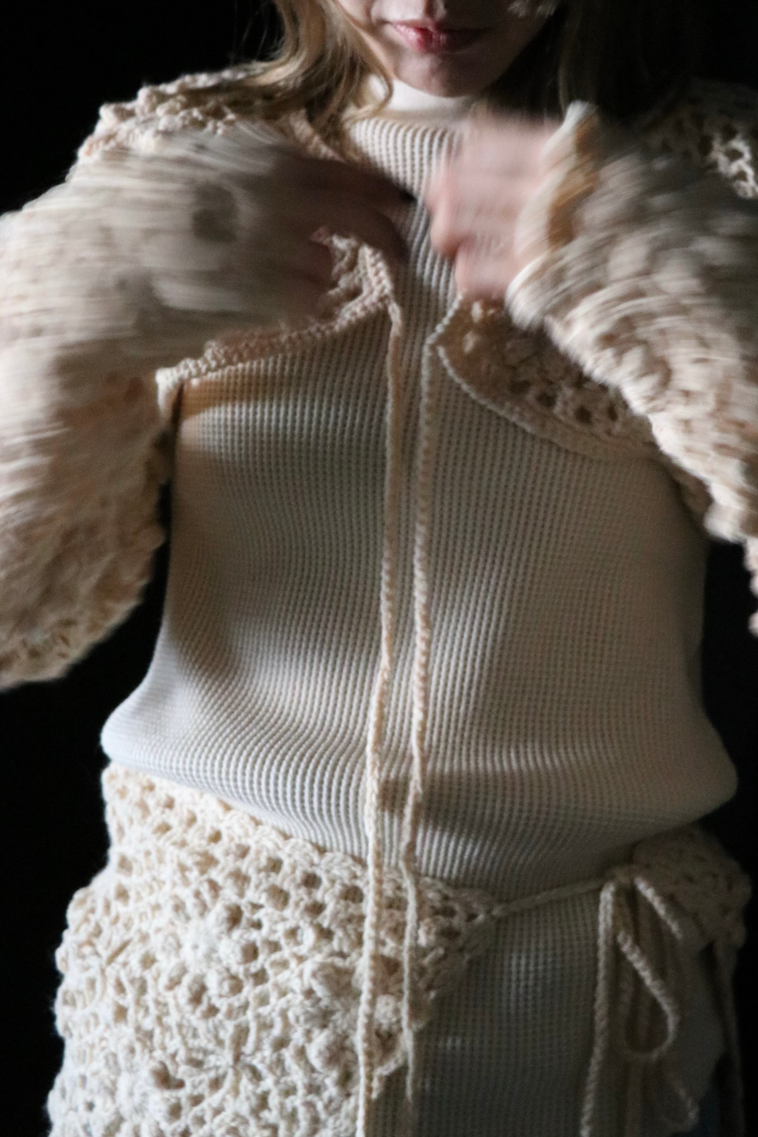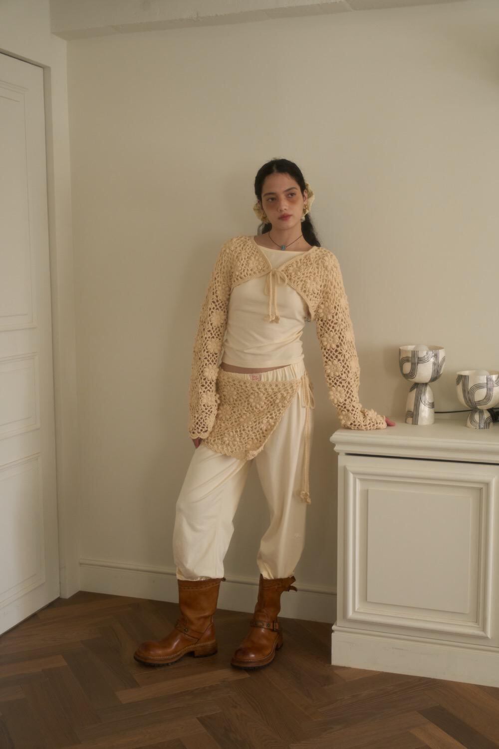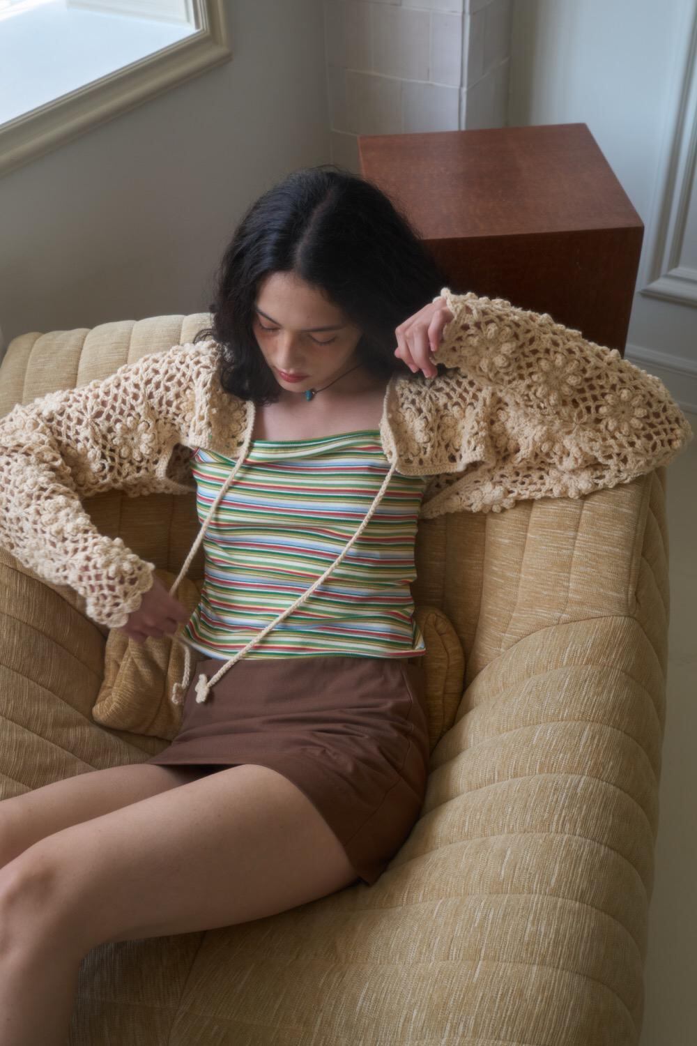 この手作りのマイクロボレロカーディガンは、ビーチウェアのカバーアップスタイリングアイテムとして推奨されます。