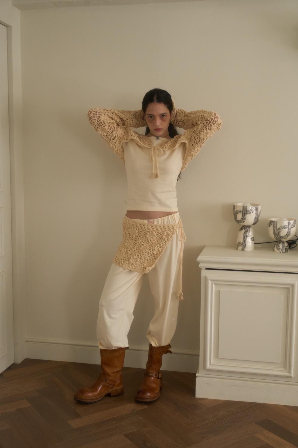 自然体でいながら、どこか印象に残るデザインバランスが特徴です。リラックスムードの中に、ヒッピーの自由さやさりげないセクシーさがにじみ、日常のワンシーンを特別にしてくれます。