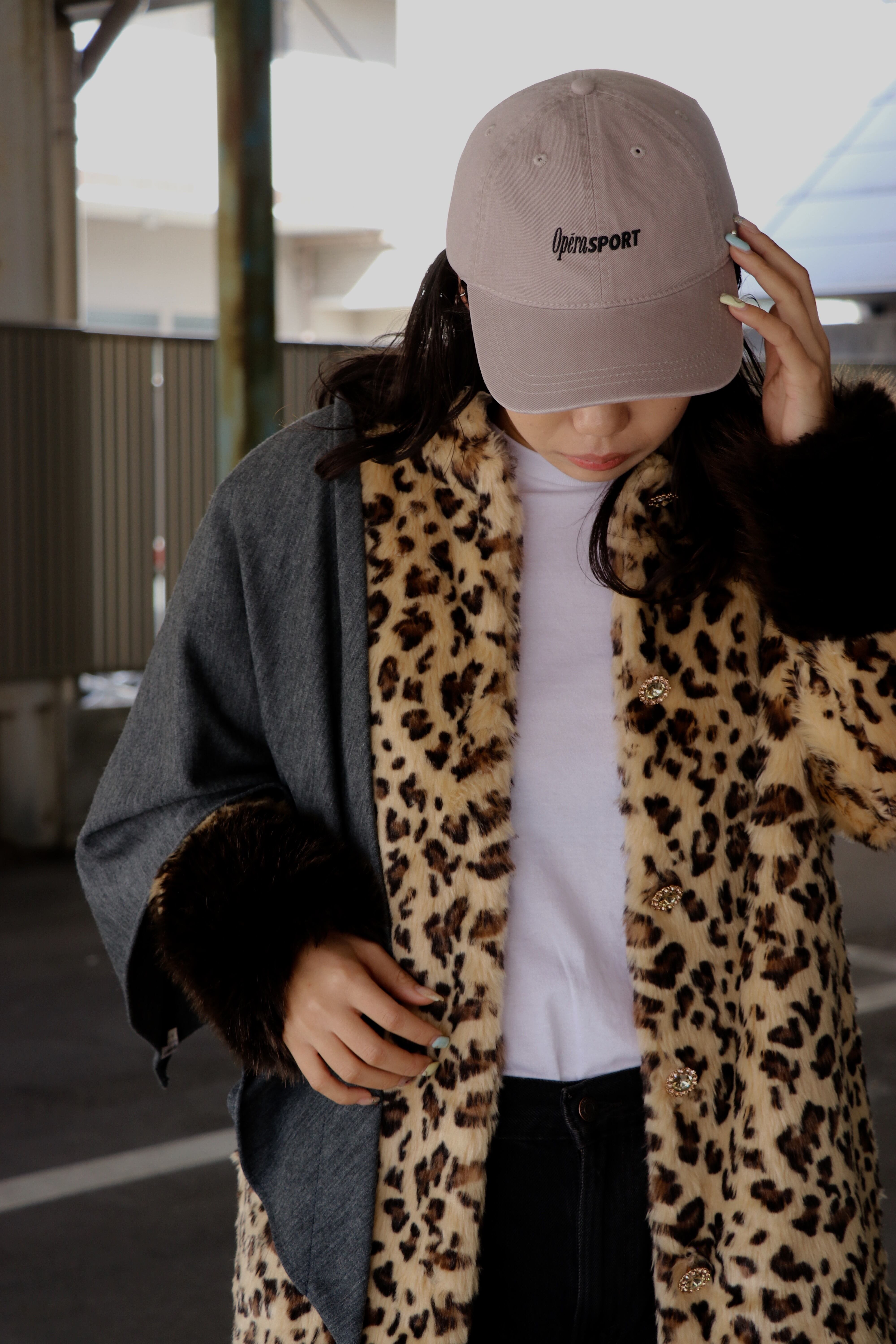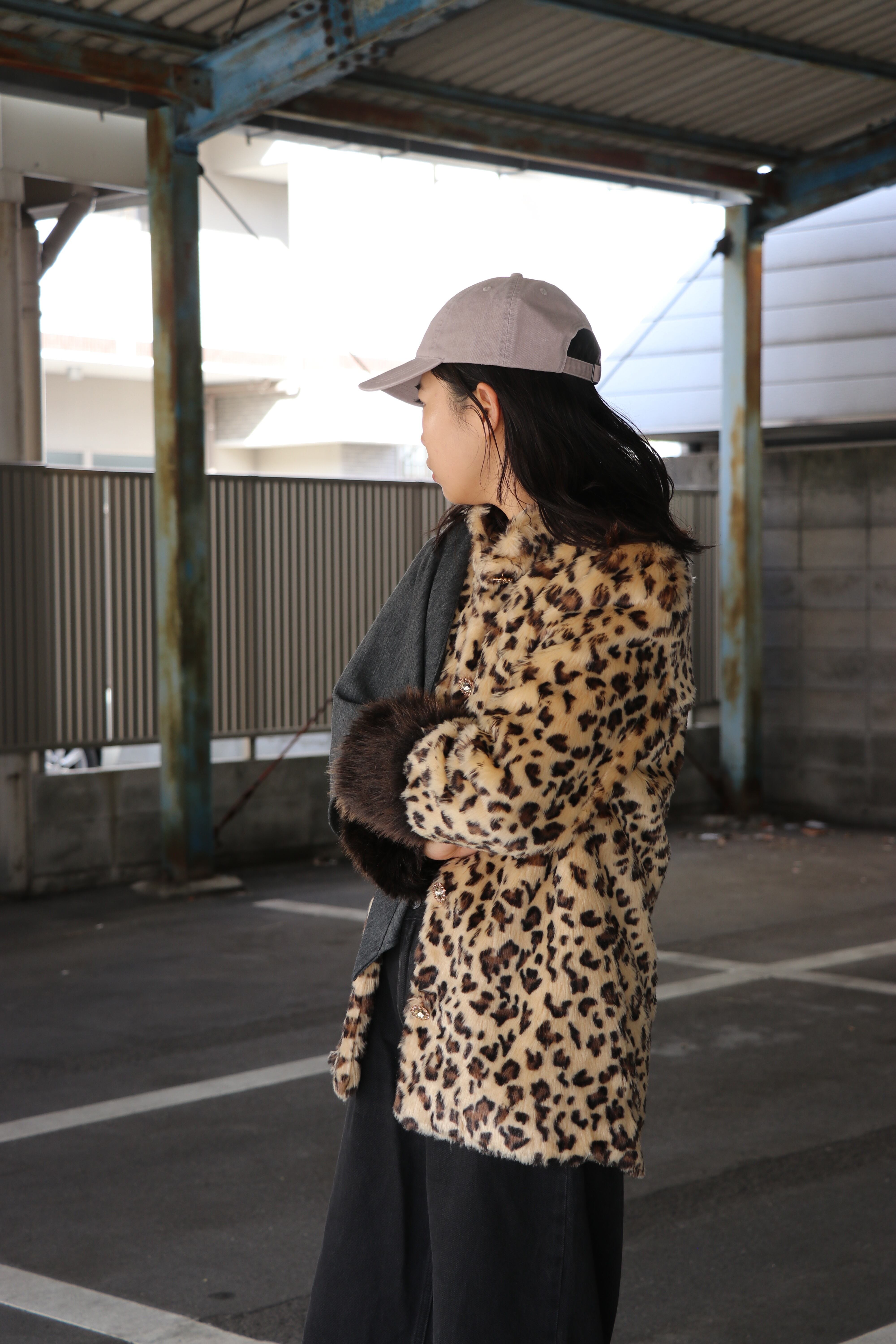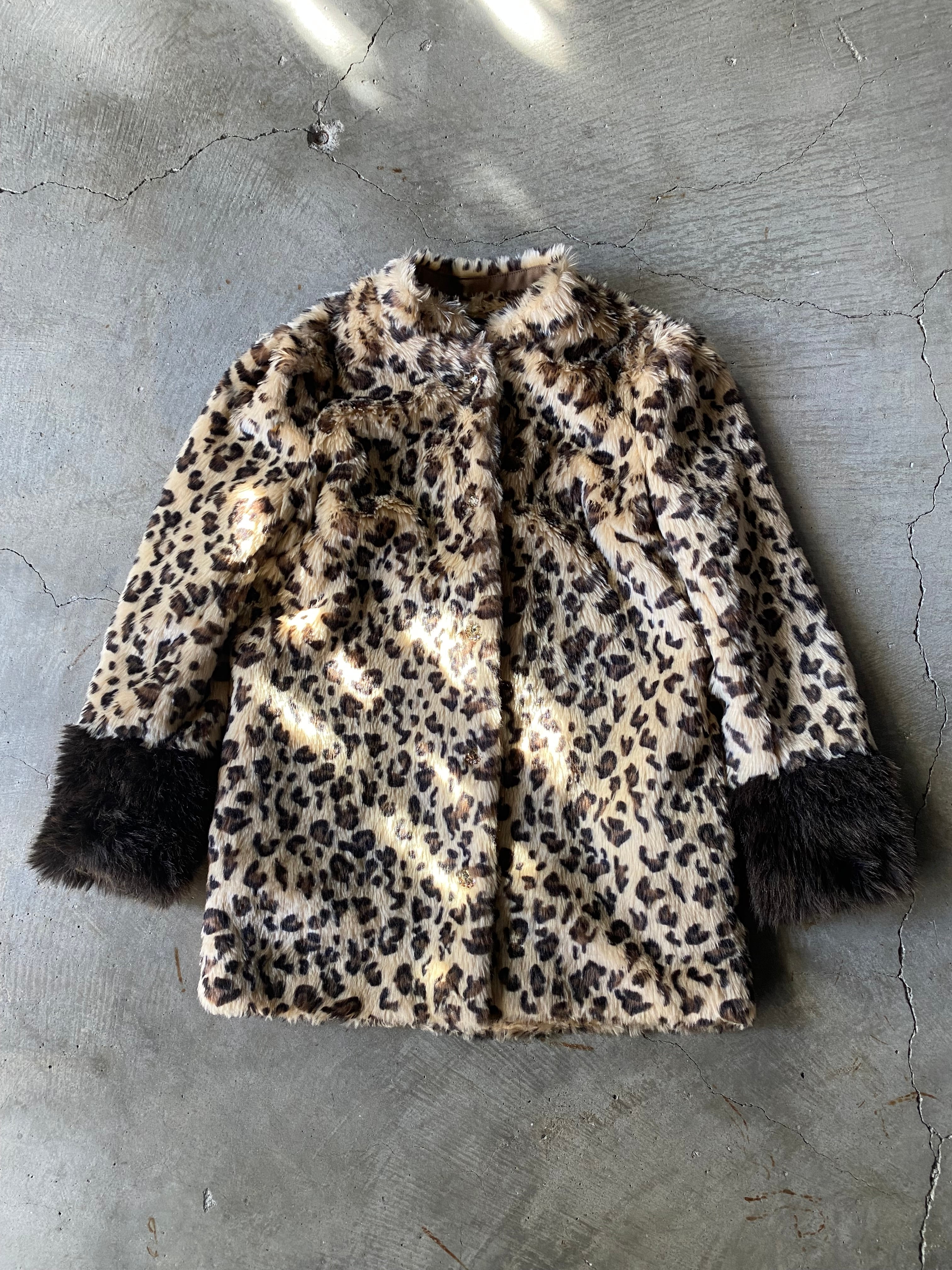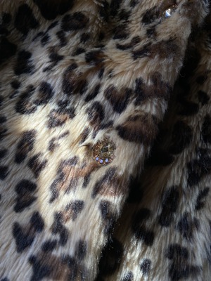 マロンコートは、レオパード柄のフェイクファー、ふわふわのカフス、そしてきらめく宝石のボタン。
