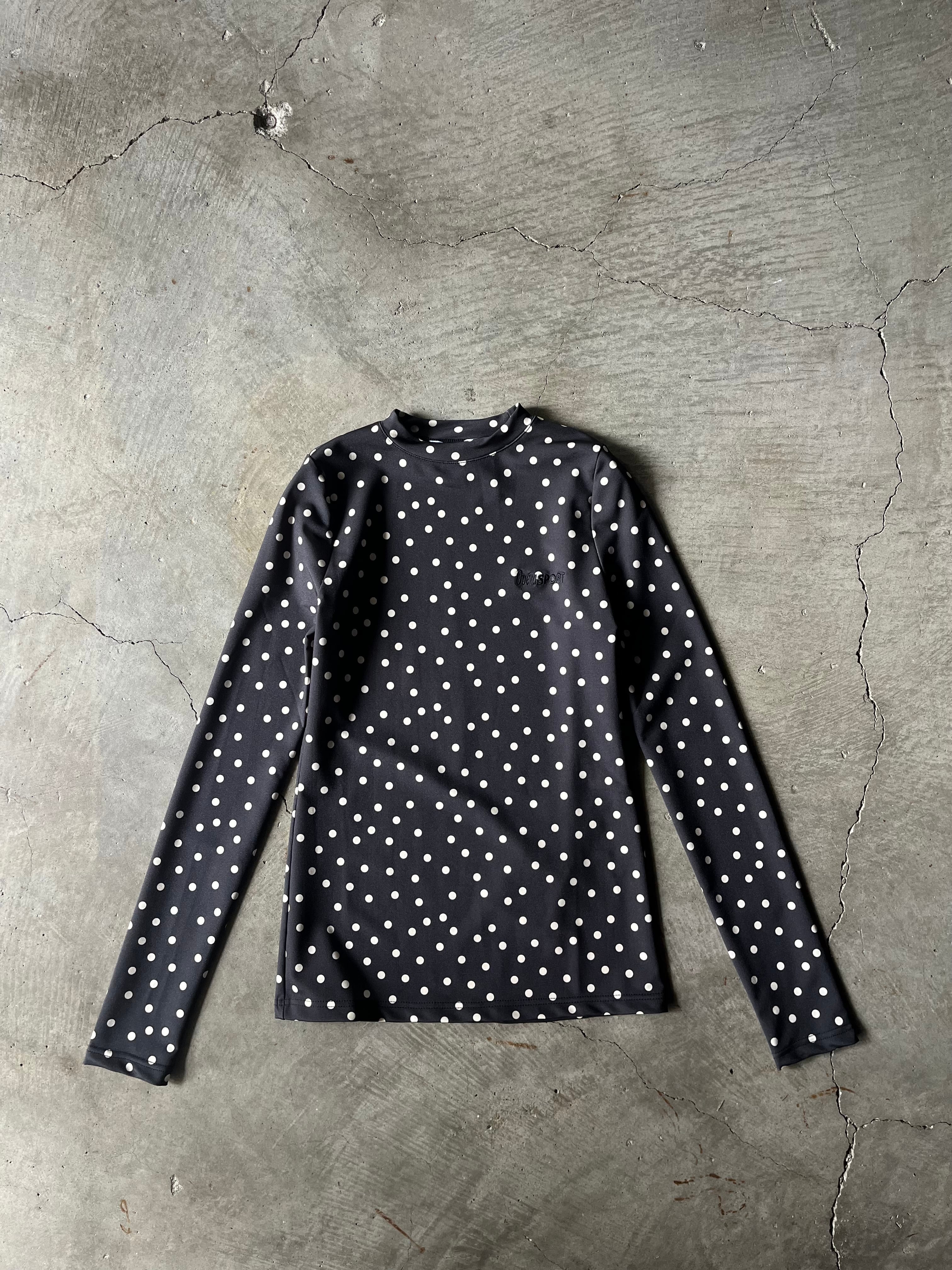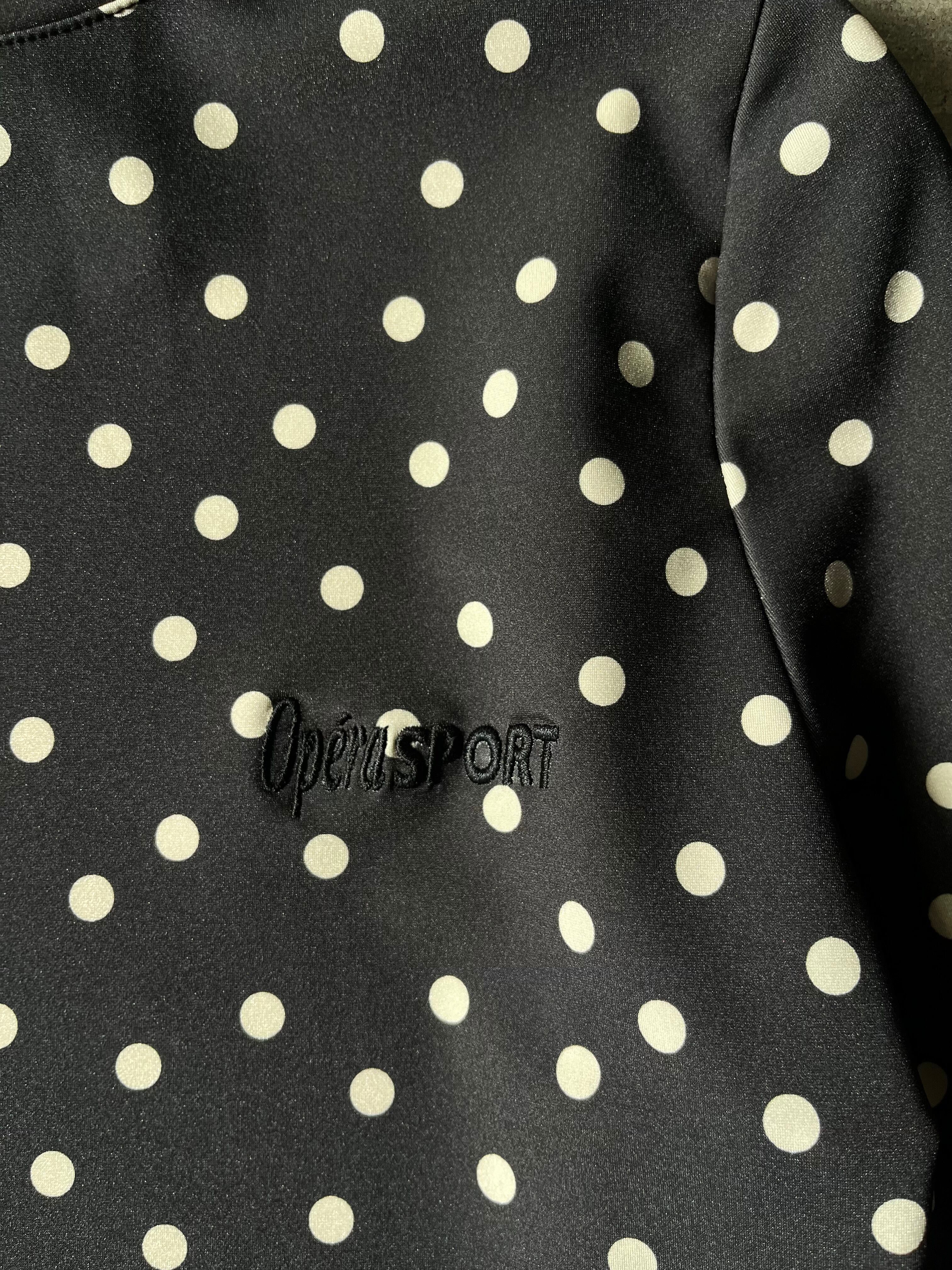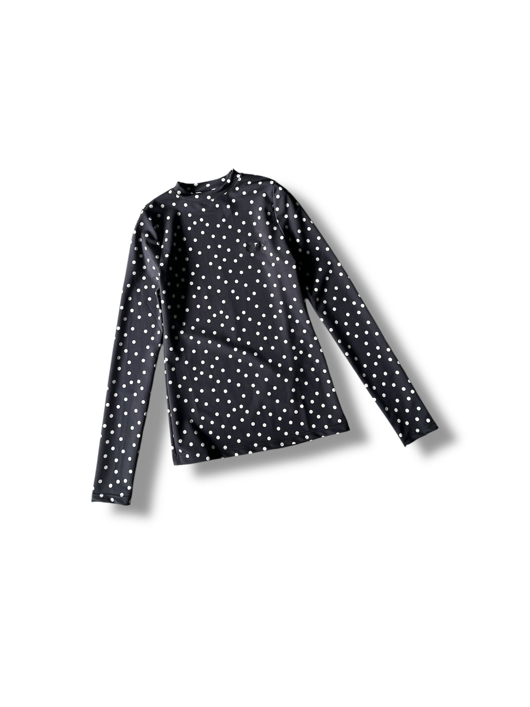 Suni Topは、82%のリサイクルポリアミドと18%スパンデックスで作られています。白いドット柄でデザインされたこのフィット感のある長袖スタイルは、ハイネックラインと胸元にシグネチャーのOpéraSPORTロゴが特徴です。伸縮性があり体にフィットするシルエットで、軽量かつ多用途であり、単独で着用することも、ジャケットやドレスの下に重ねて着用することも容易です。