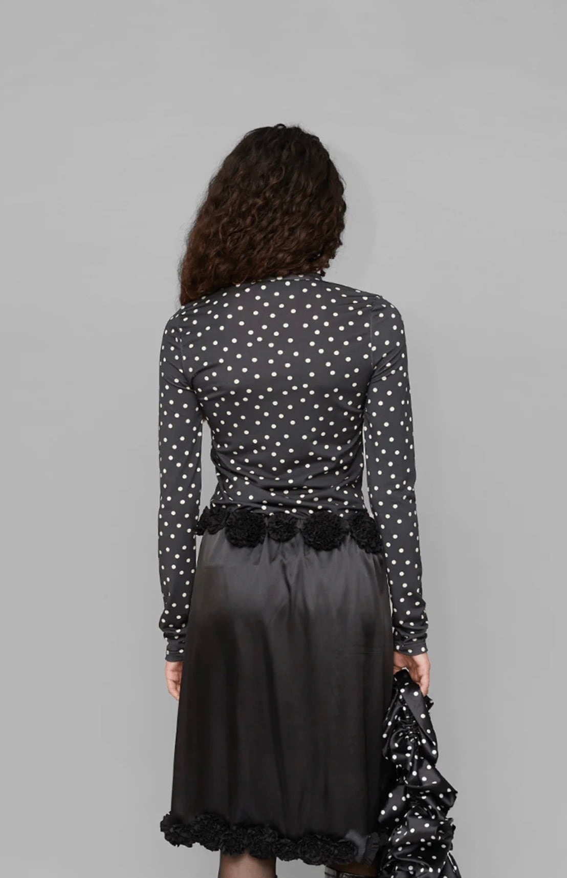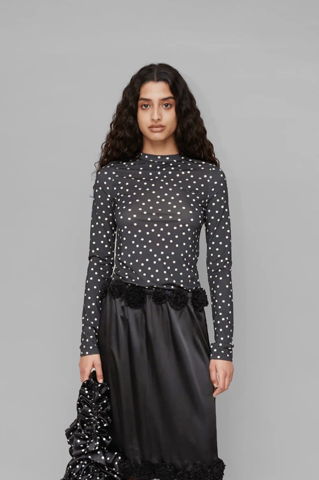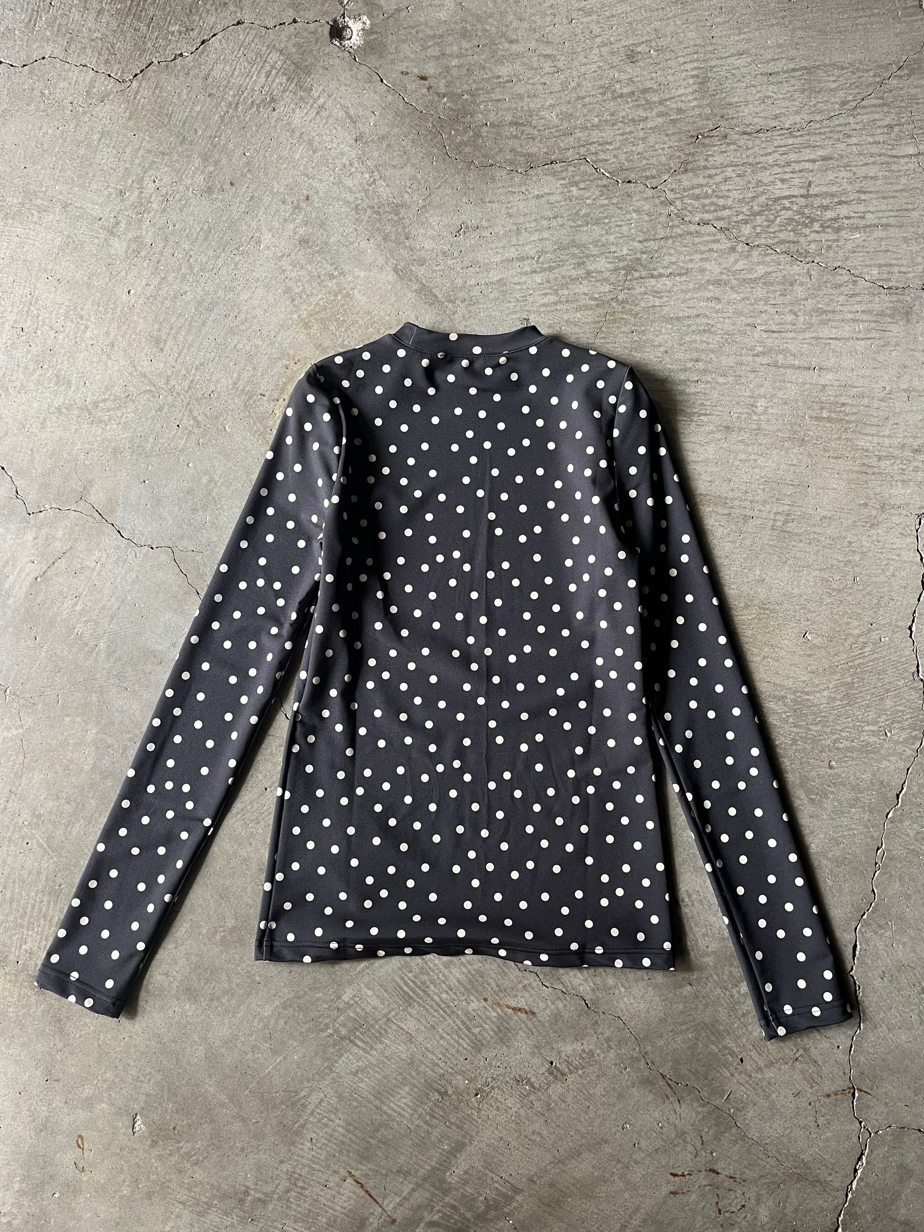 Suni Topは、82%のリサイクルポリアミドと18%スパンデックスで作られています。白いドット柄でデザインされたこのフィット感のある長袖スタイルは、ハイネックラインと胸元にシグネチャーのOpéraSPORTロゴが特徴です。伸縮性があり体にフィットするシルエットで、軽量かつ多用途であり、単独で着用することも、ジャケットやドレスの下に重ねて着用することも容易です。