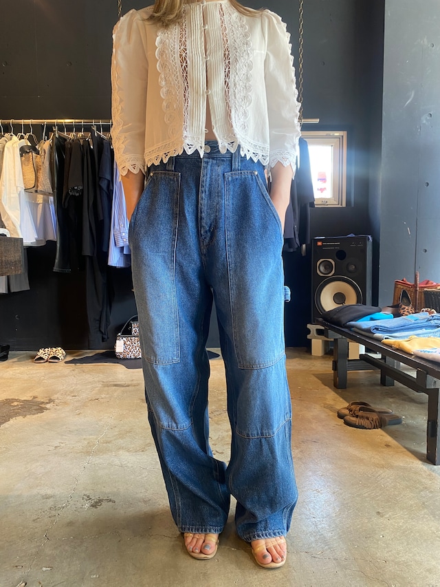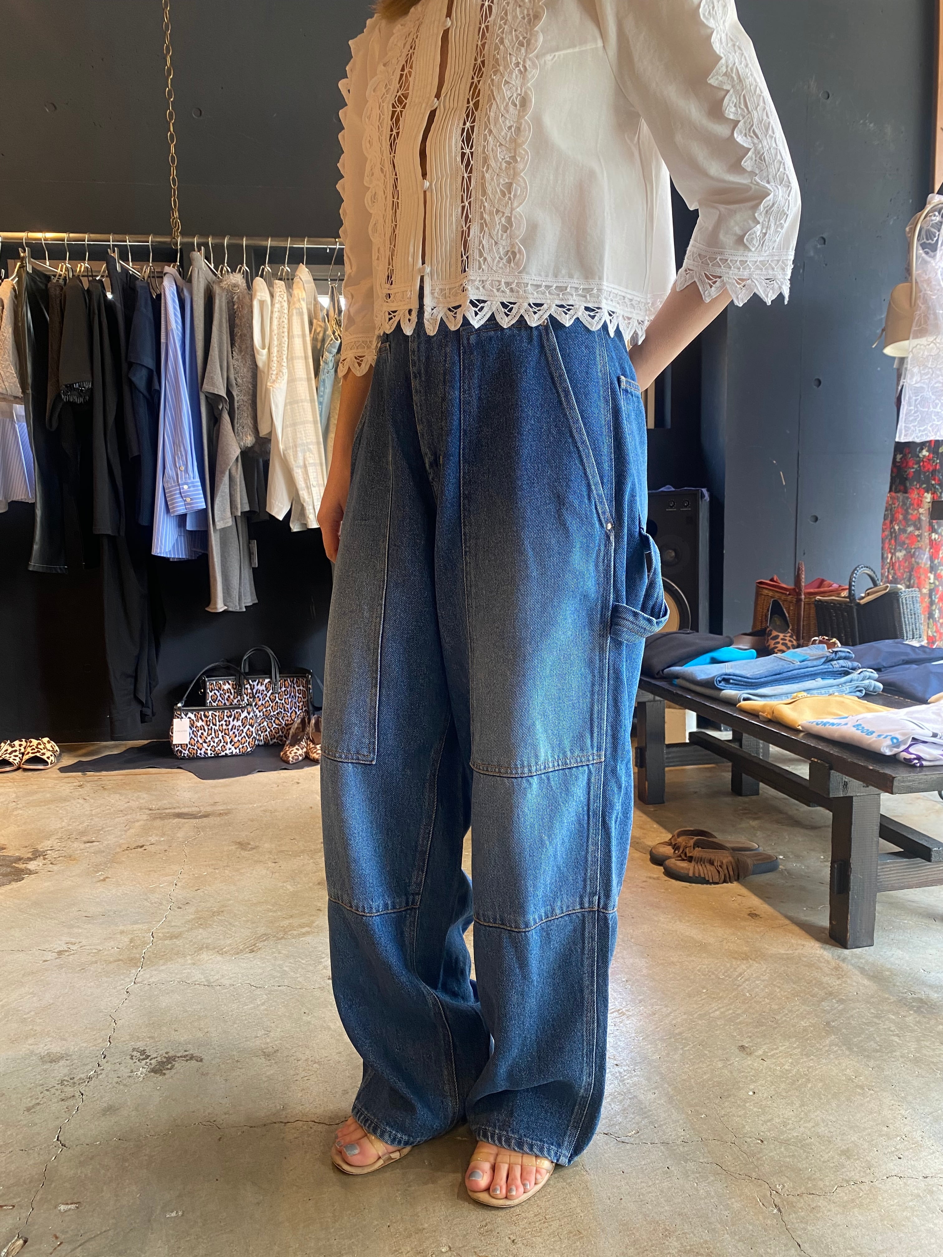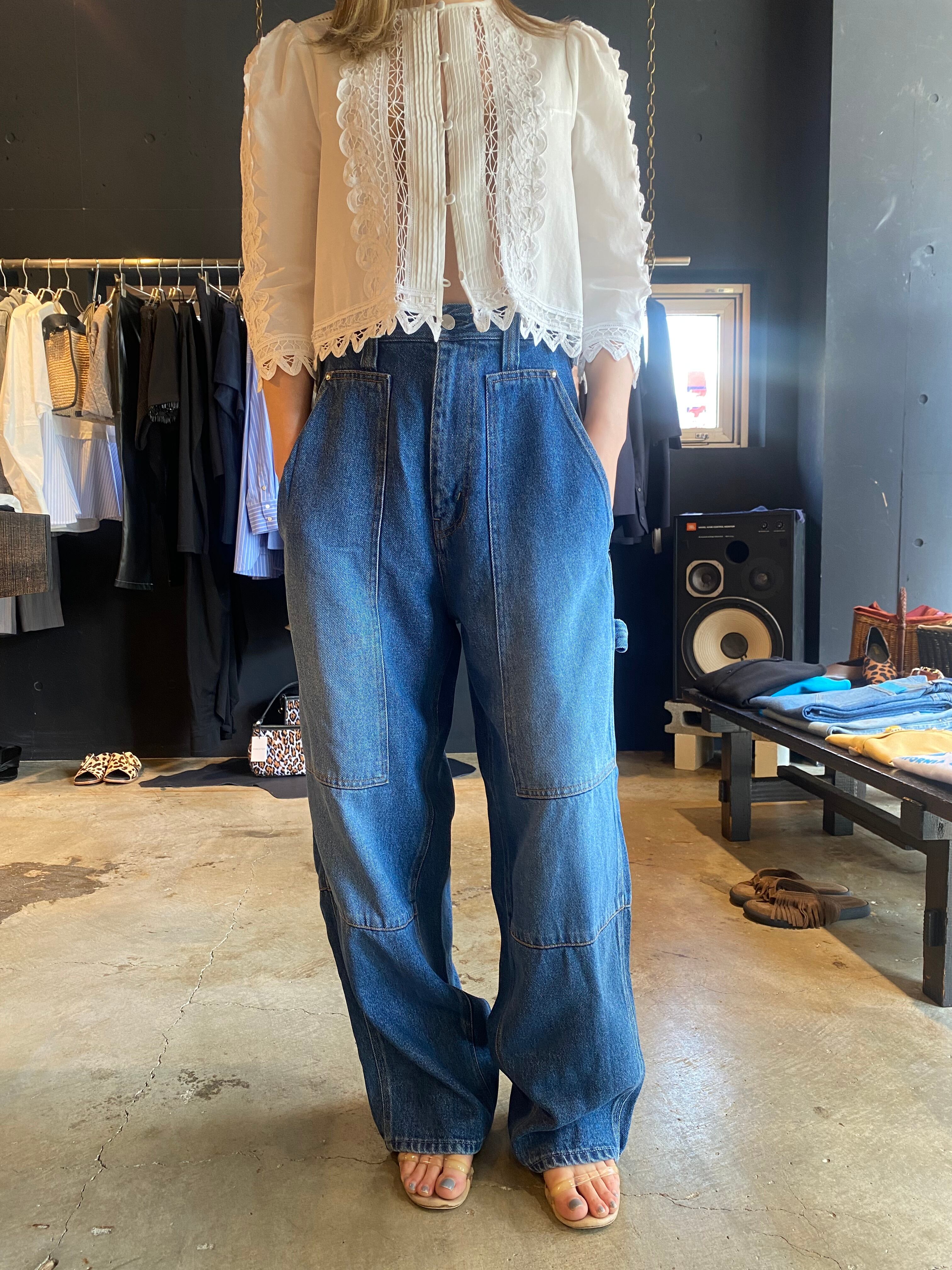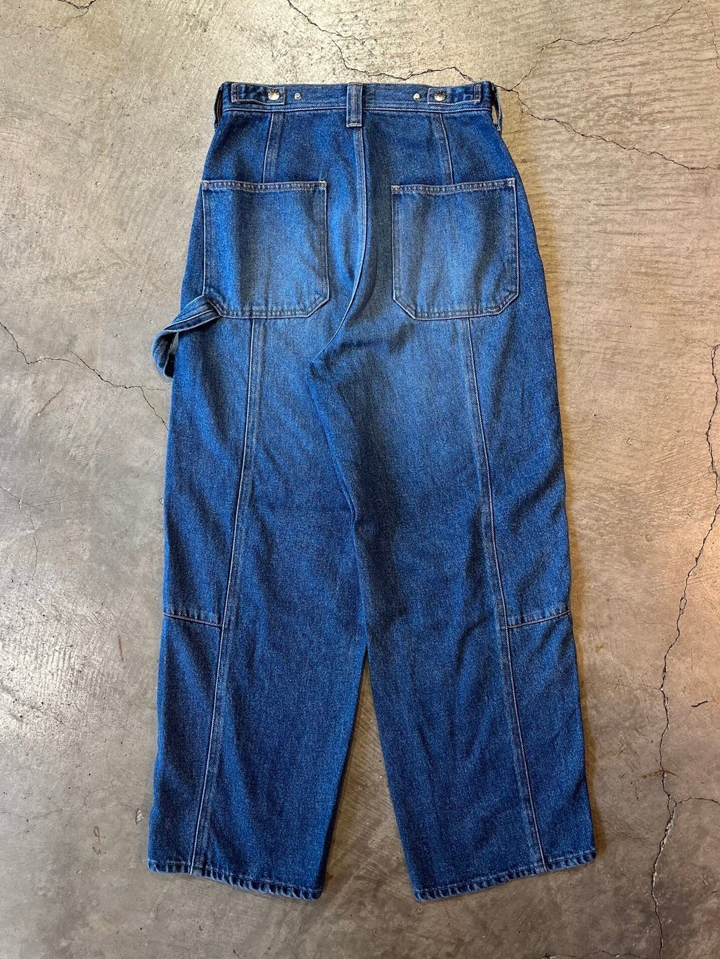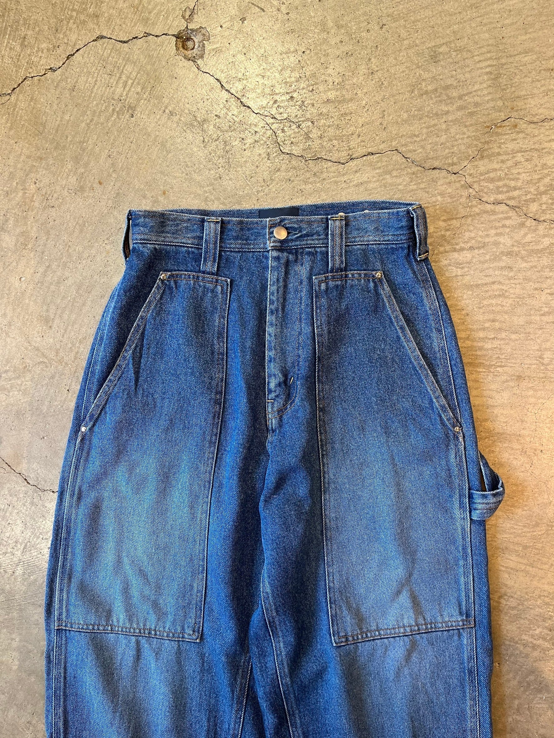 ペインターパンジ"ペインターパンツ(ハイウエストルーズバギー)ハイウエストと裾にかけてゆったいとしたバギーシルエット。フロントの斜めのインサイドシーム、大きなポケットが特徴的で、後のウエストベルトのアジャスタータブで、ウエストの絞りをアレンジできます。