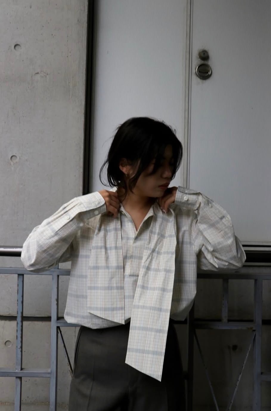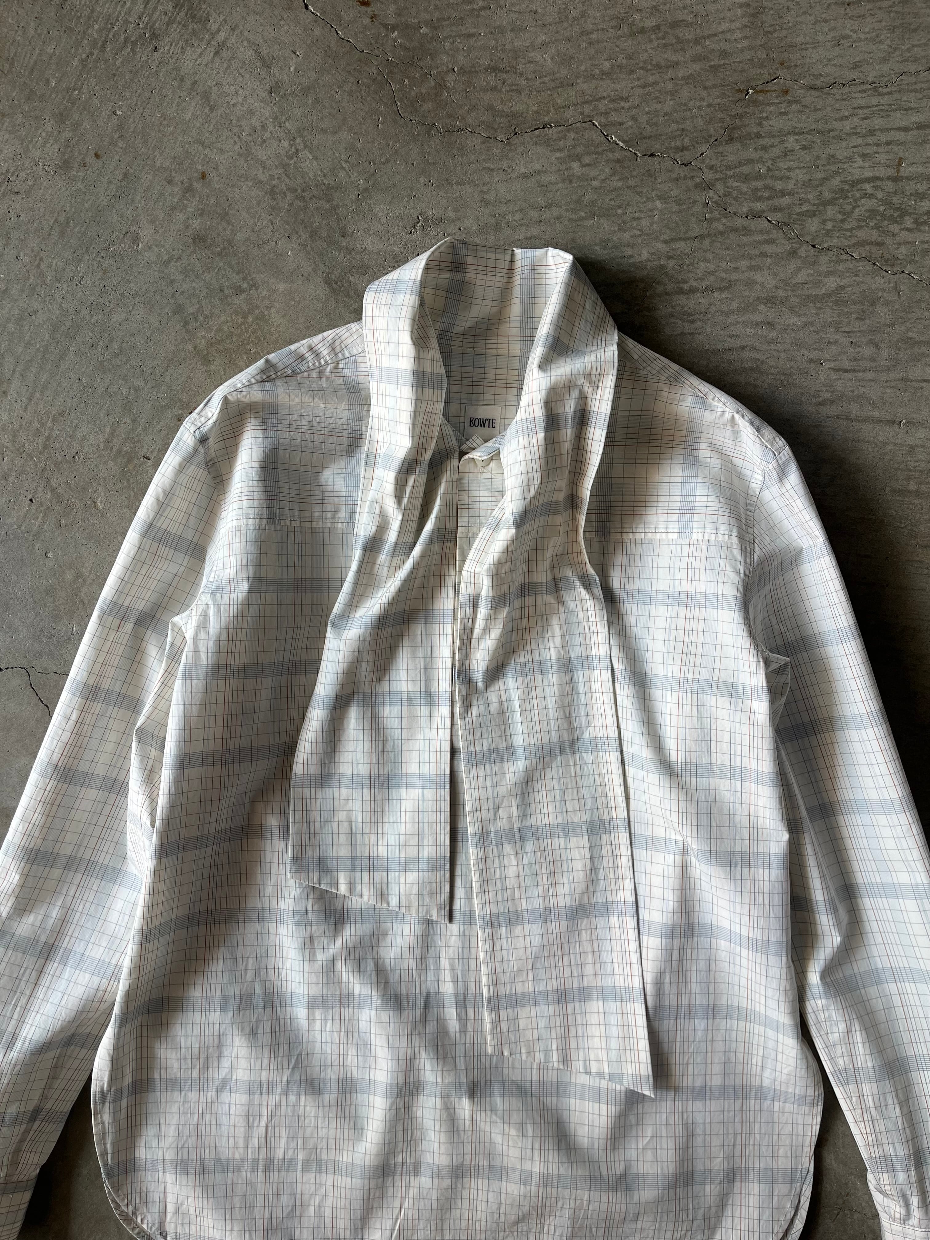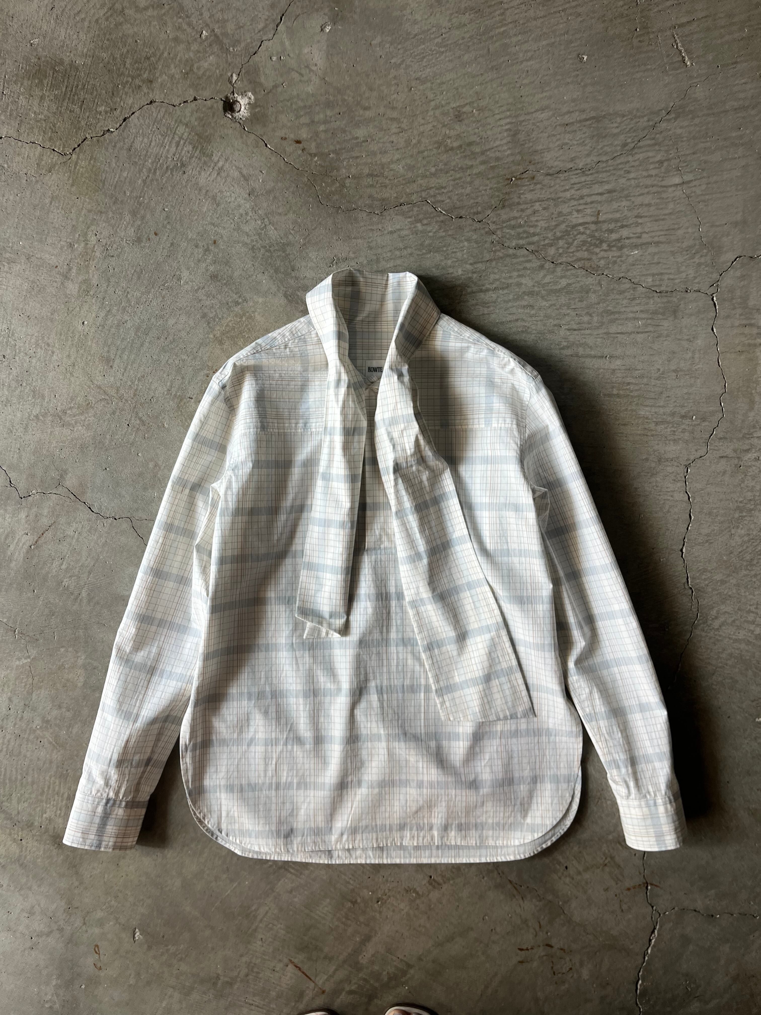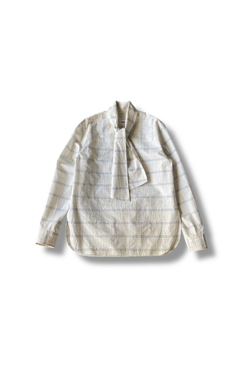 今回この柄のインスピレーション源となった【AGNES MARTIN】という女性アーティスト。彼女の作画は常に均整のとれたミニマリズムをグリットで統一されたアートの数々。淡く控えめなトーンで織りなすBOWTEのチェックは、さながら大学ノートにありそうなカラートーンに落とし込み オリジナルのグラフィックを完成させました。極細番手のフェザーウェイトコットンで、ラフな対応のボウ衿ブラウス。大人しめな色柄のボウブラウスは無地ライクに着こなし巾を広げます。まだ肌寒い季節は羽織やニットのインにした際に衿元や袖先からボウやカフスを見せポイントにしたり、一枚着はフロントボタンはいくつか開けてボウはラフにそのまま垂らしたり、片側をひとかけ結んでハイネックの様に見せて後ろへ回したりなどのアレンジでイージーに着まわしていただけます。