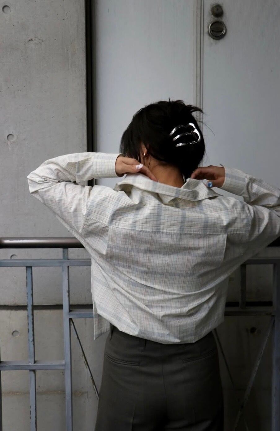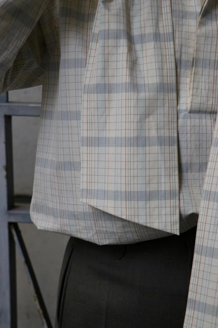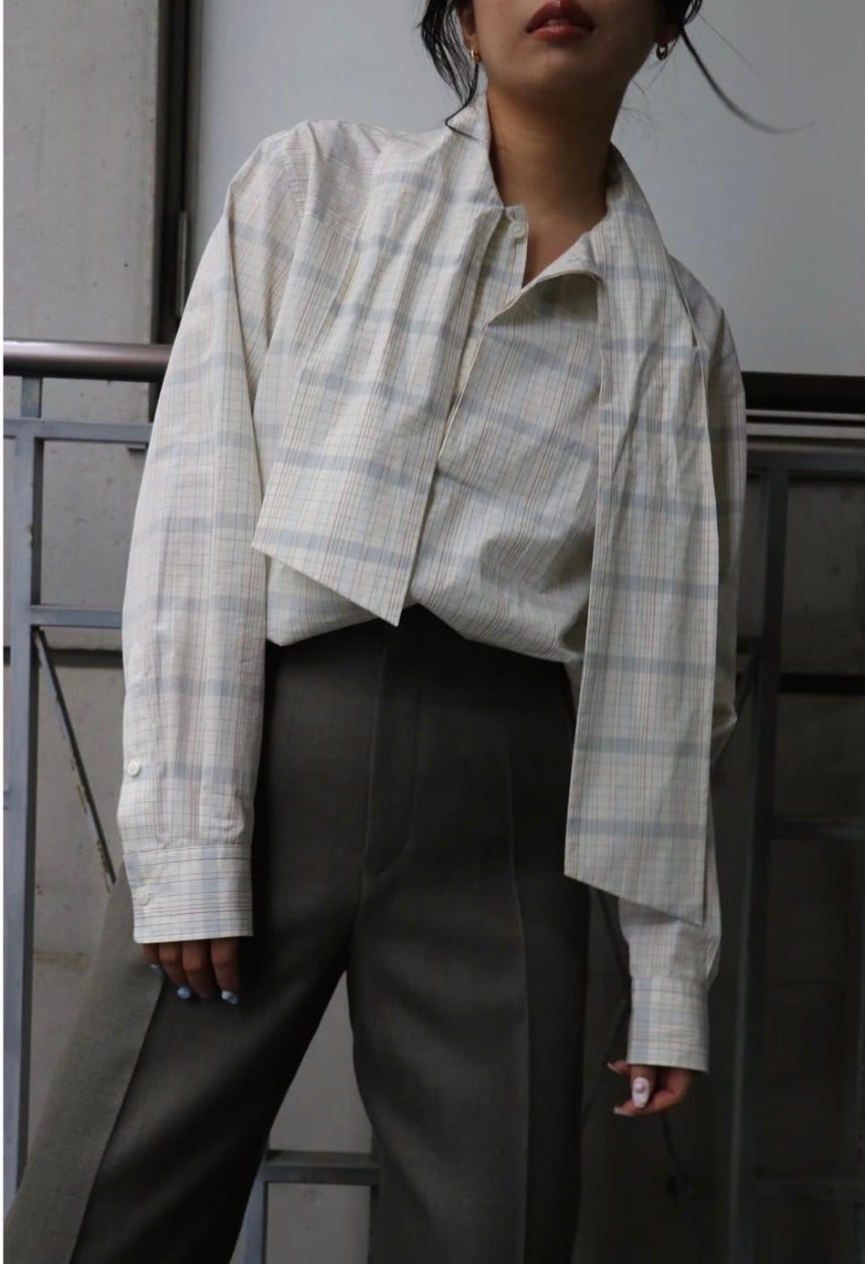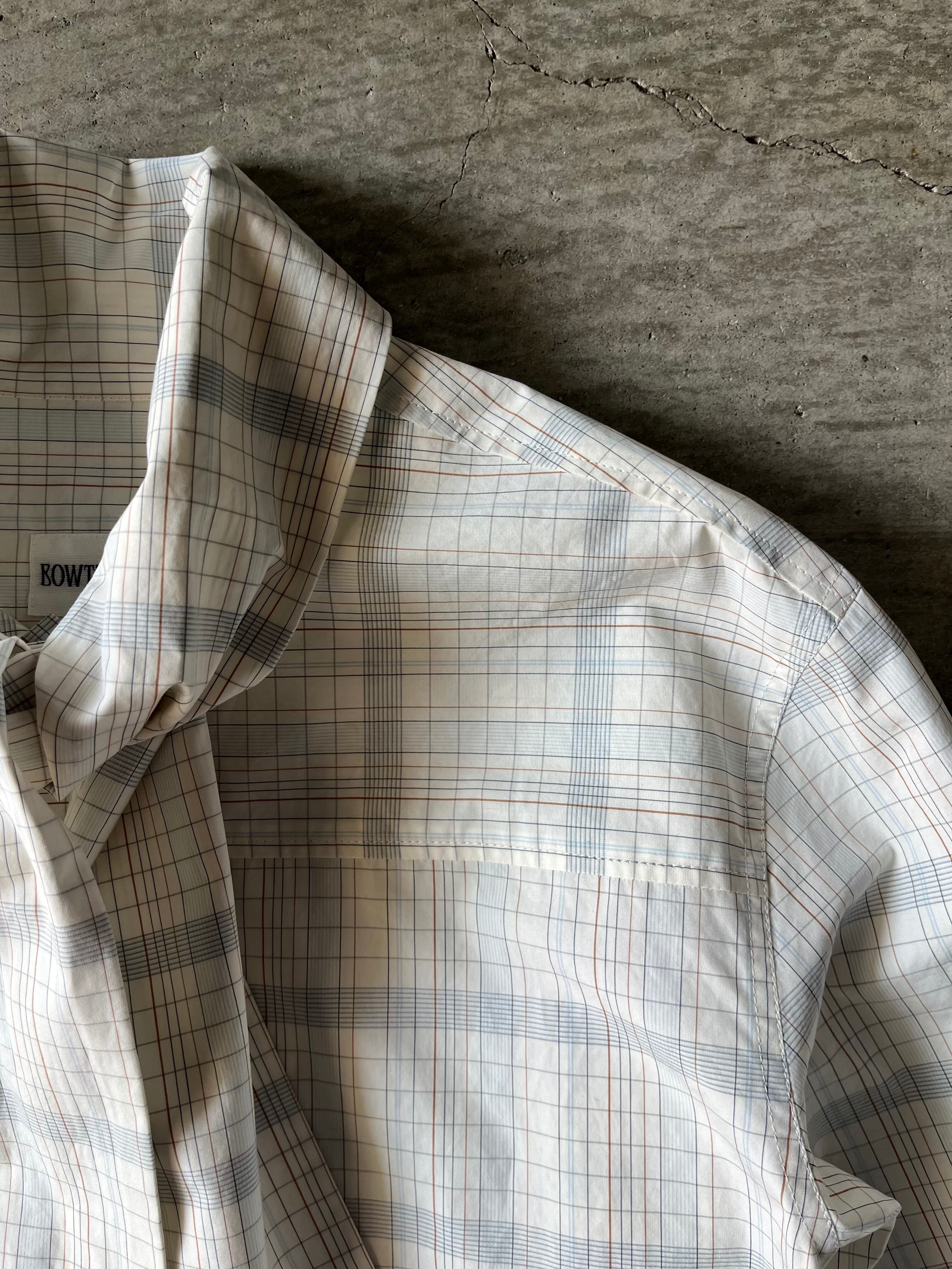 今回この柄のインスピレーション源となった【AGNES MARTIN】という女性アーティスト。彼女の作画は常に均整のとれたミニマリズムをグリットで統一されたアートの数々。淡く控えめなトーンで織りなすBOWTEのチェックは、さながら大学ノートにありそうなカラートーンに落とし込み オリジナルのグラフィックを完成させました。極細番手のフェザーウェイトコットンで、ラフな対応のボウ衿ブラウス。大人しめな色柄のボウブラウスは無地ライクに着こなし巾を広げます。まだ肌寒い季節は羽織やニットのインにした際に衿元や袖先からボウやカフスを見せポイントにしたり、一枚着はフロントボタンはいくつか開けてボウはラフにそのまま垂らしたり、片側をひとかけ結んでハイネックの様に見せて後ろへ回したりなどのアレンジでイージーに着まわしていただけます。