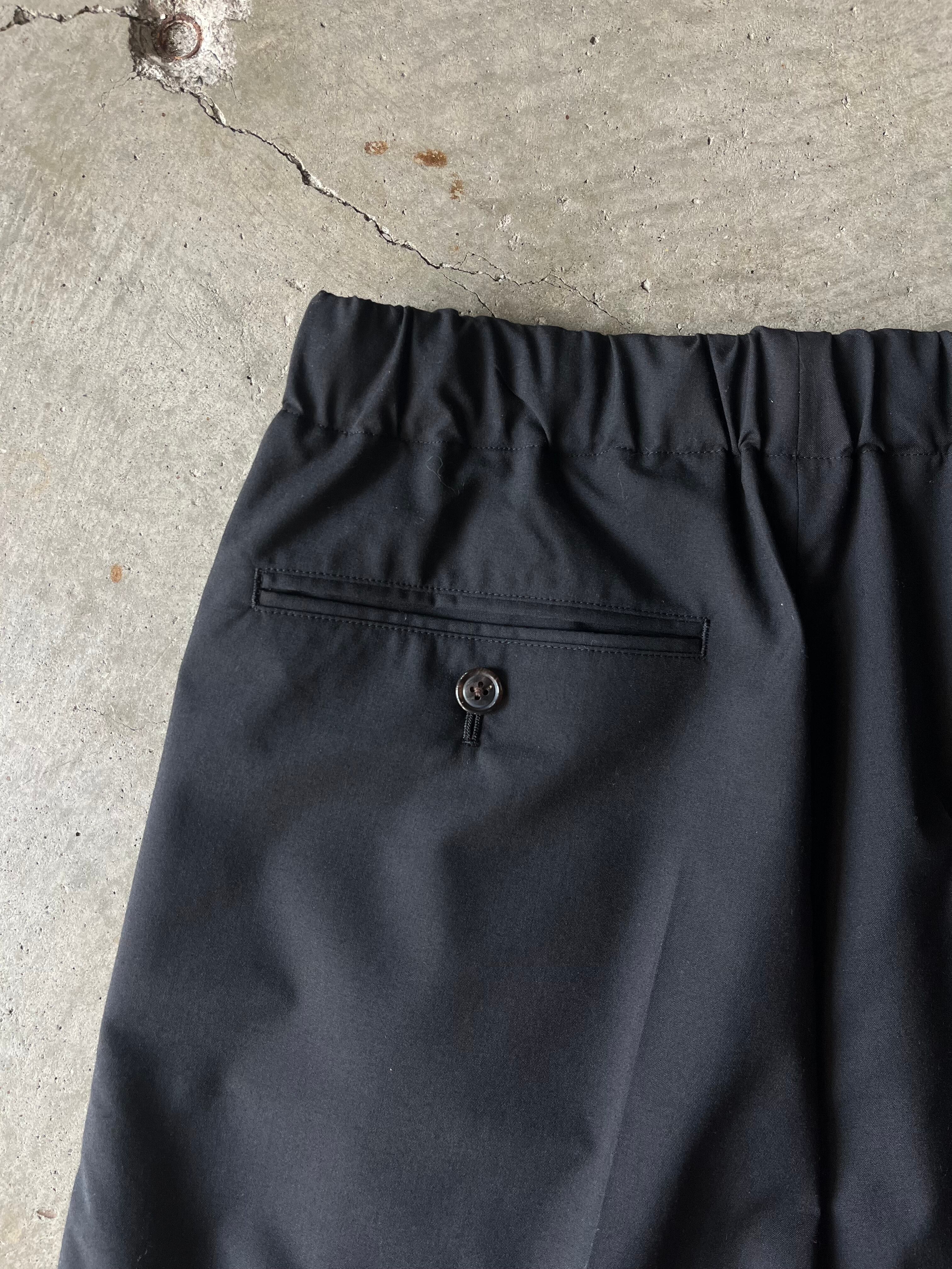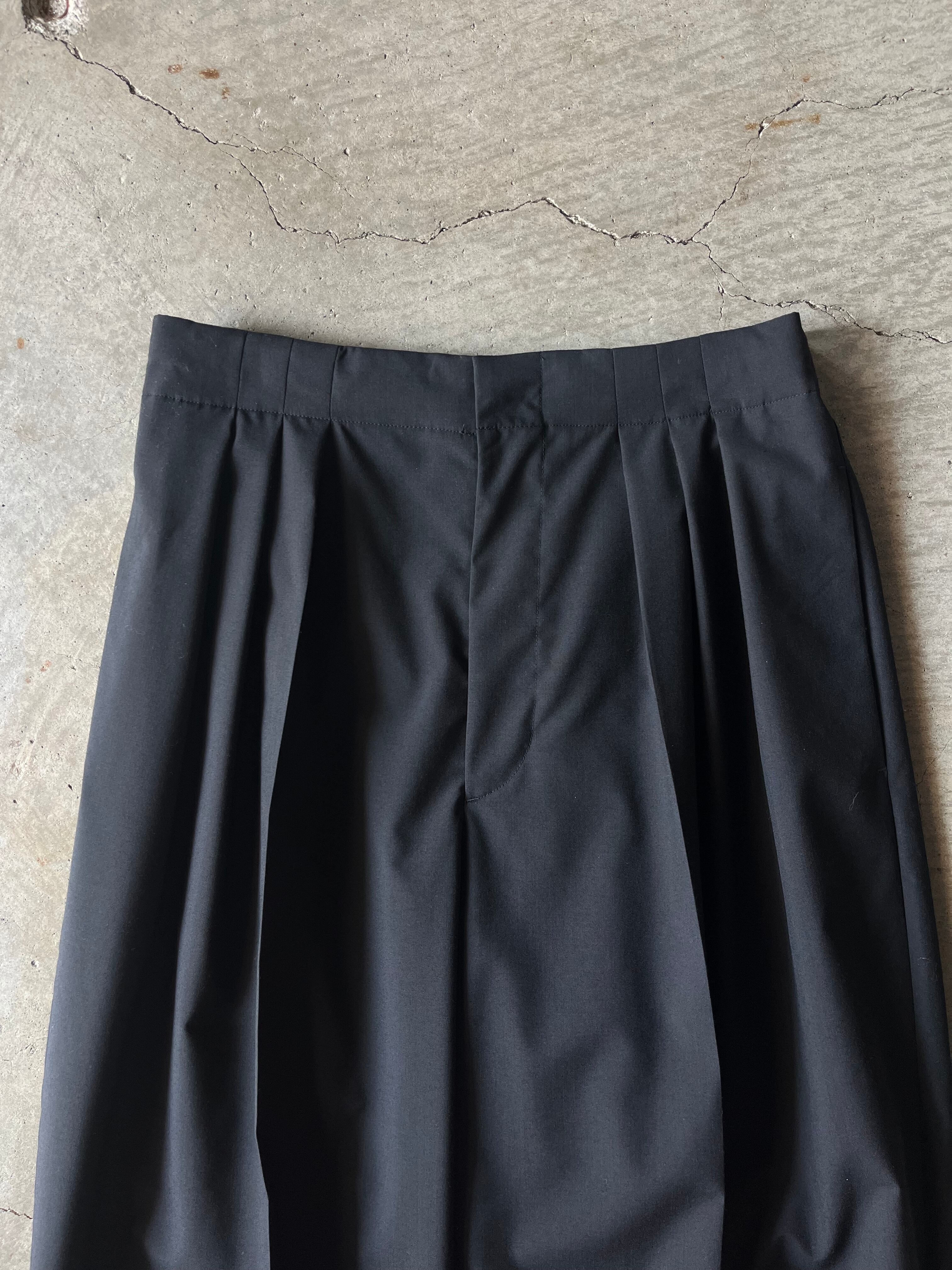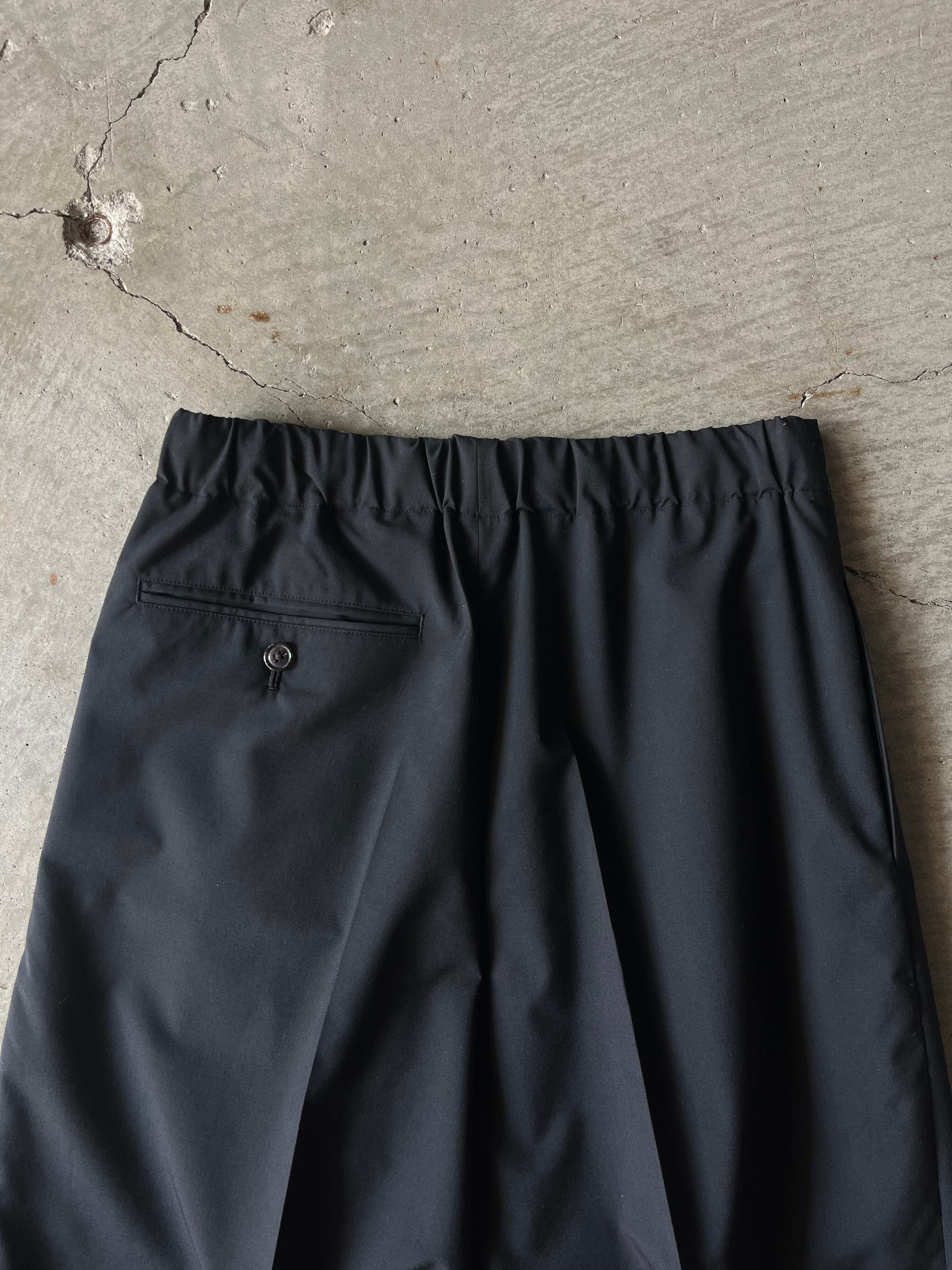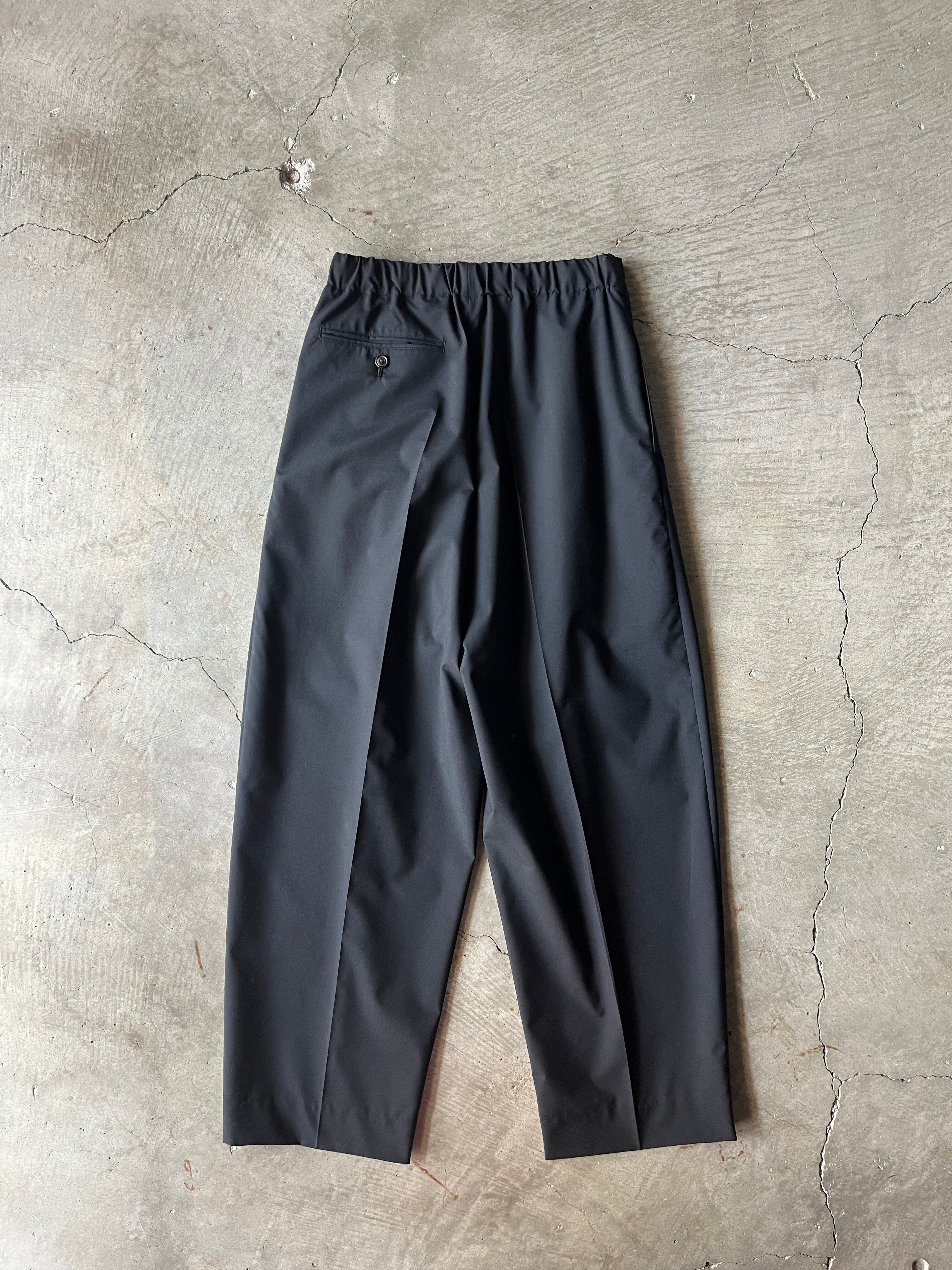 素材はsuper140s原料120番という細番手からなる高密度な梳毛トロピカル平組織を 最終工程で滑らかな仕上げを更に施すことにより上質な着心地を追求。一見ドレストラウザースを思わせる均整な3タックを施したディテールでありながら、ウエストはドローコード付きのイージーコンフォート仕様であることで、義心地はまらずキレイ見えに。たっぷりと3タックが全体のワイドフィットのボリュームを出し、裾に向けて僅かに筒巾を削ることで脚元は広がりすぎない絶妙な分量感が吟味されたモダンなエレガンスが感じられるフォルム。緩く腰を落とし ローな目線が引き続き今季の気分。