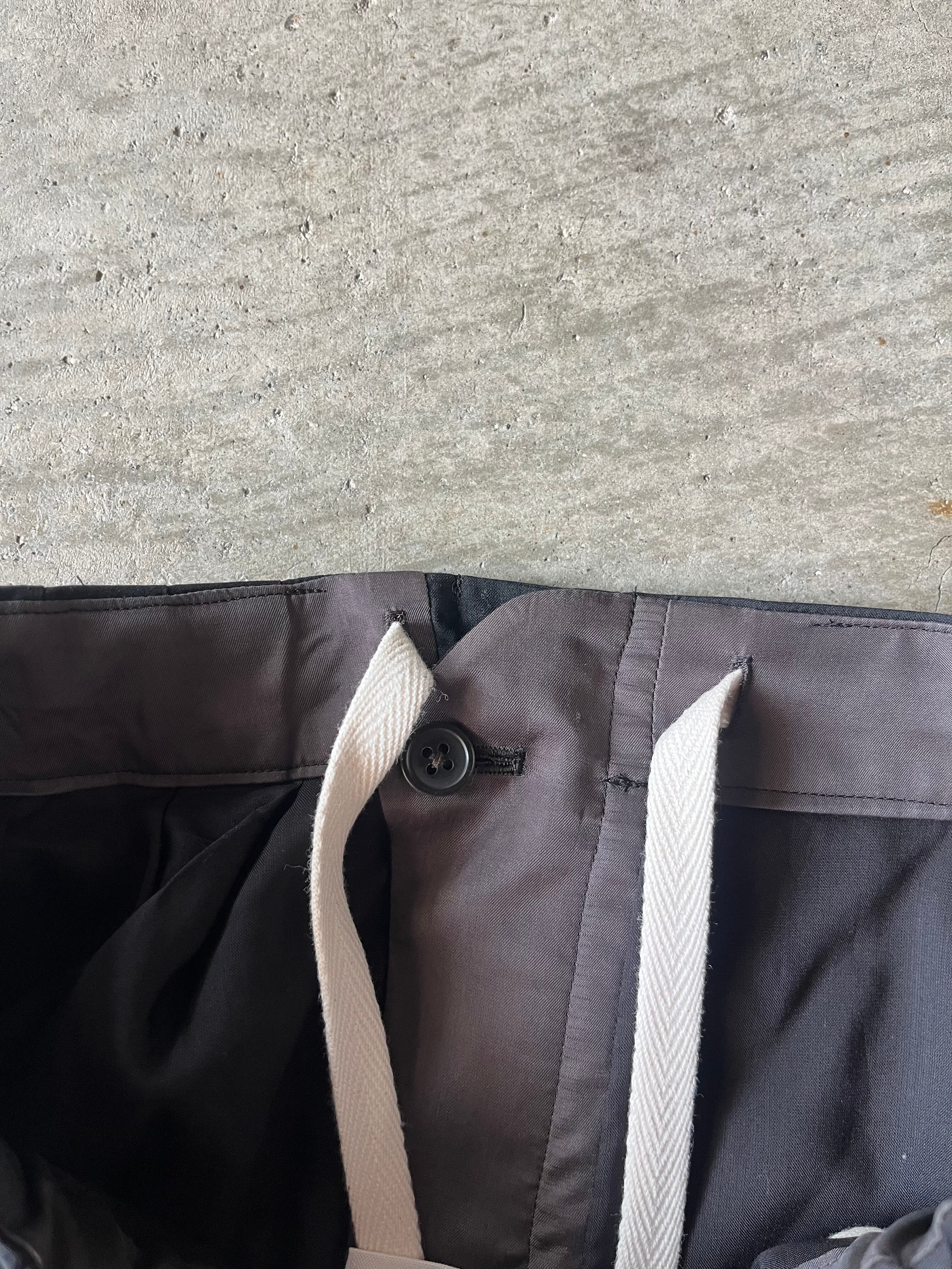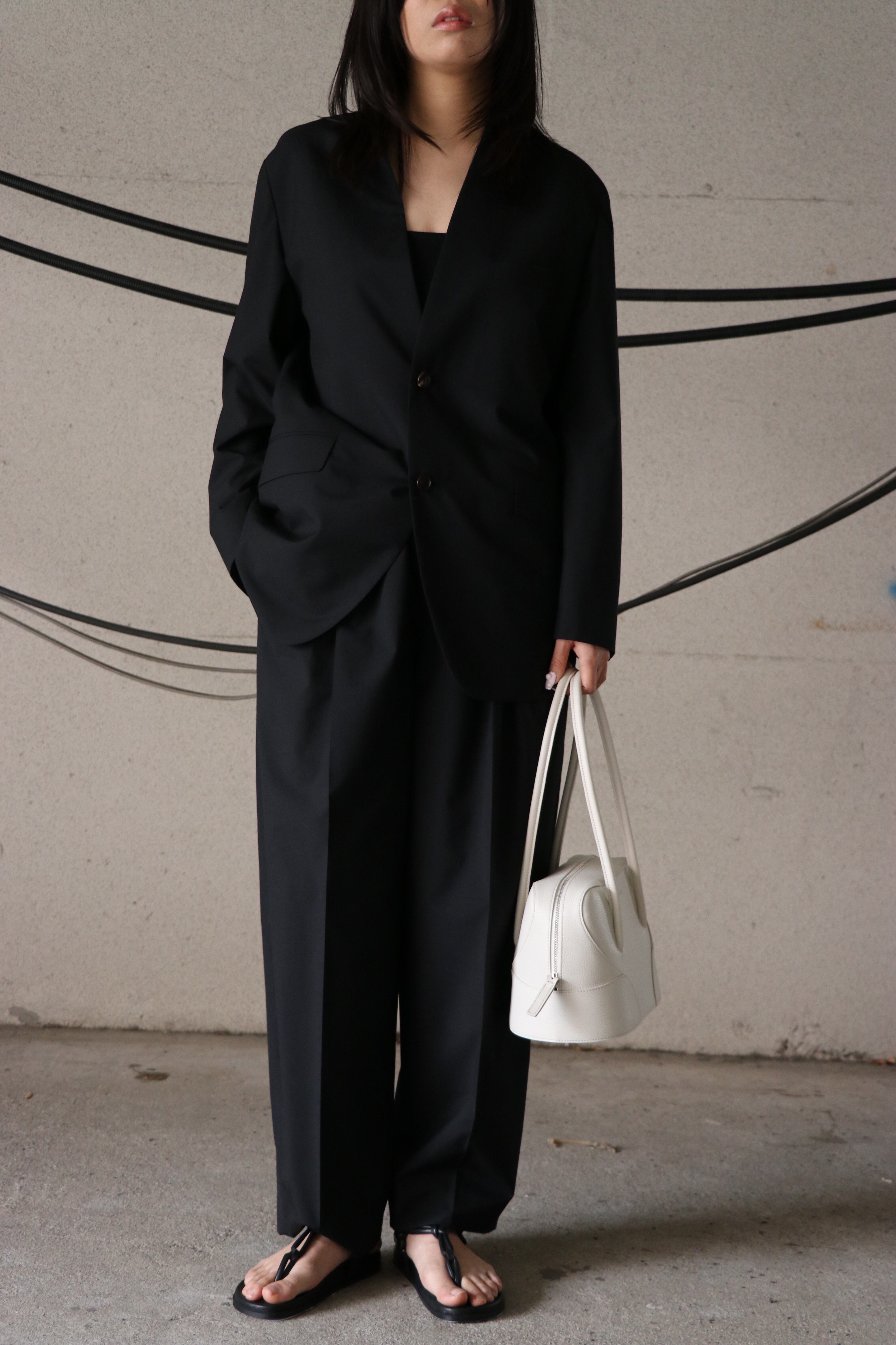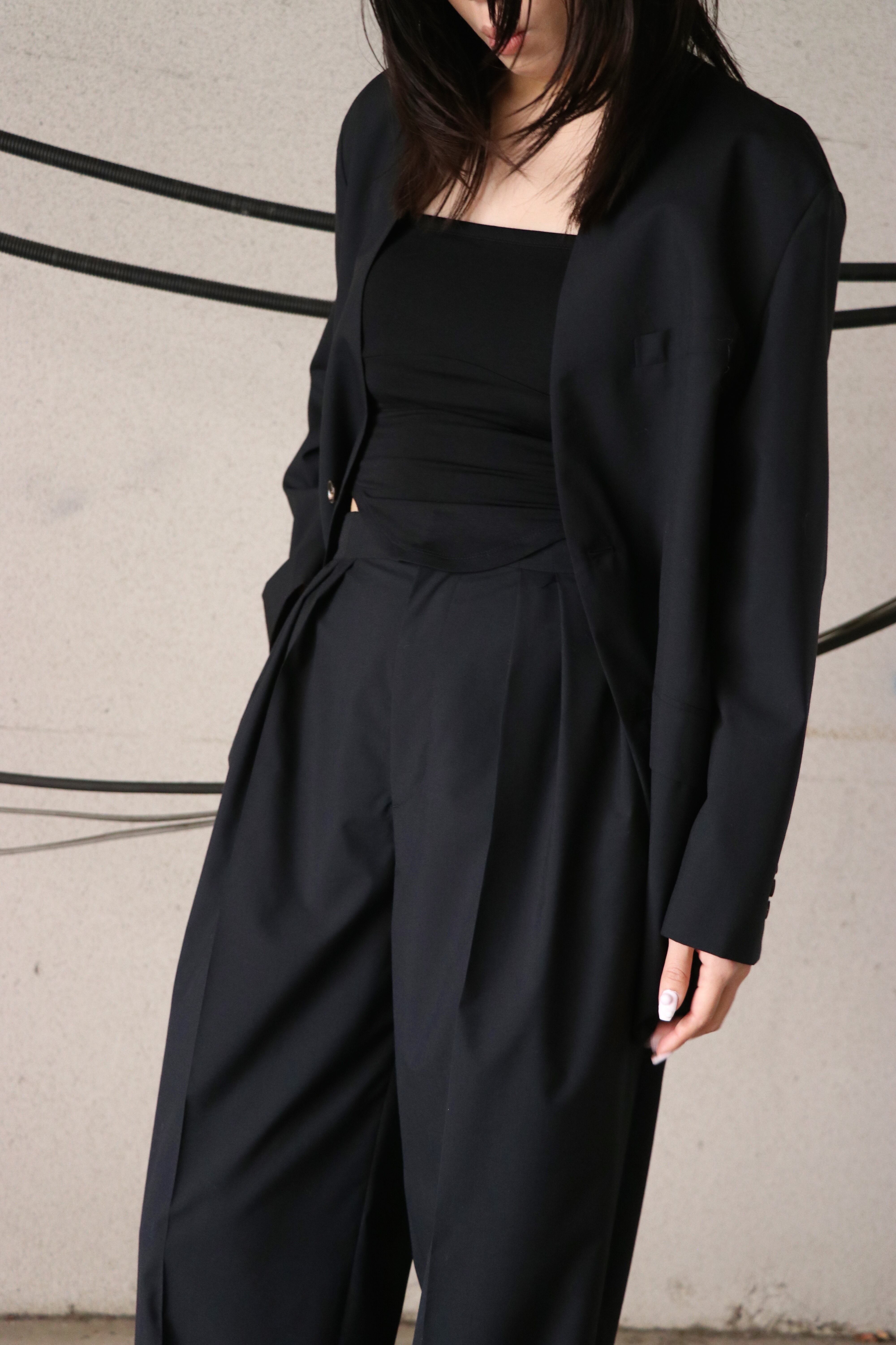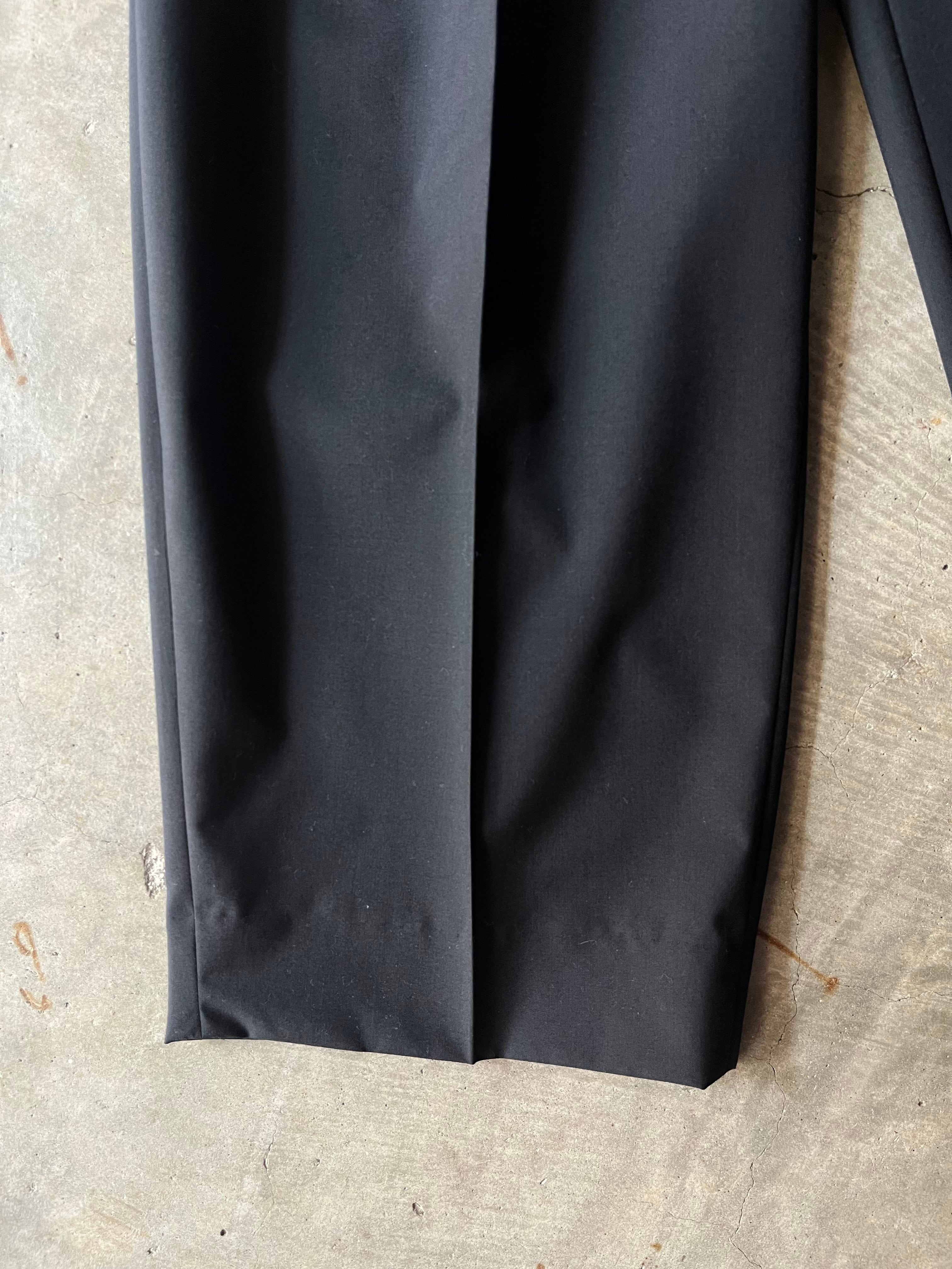素材はsuper140s原料120番という細番手からなる高密度な梳毛トロピカル平組織を 最終工程で滑らかな仕上げを更に施すことにより上質な着心地を追求。一見ドレストラウザースを思わせる均整な3タックを施したディテールでありながら、ウエストはドローコード付きのイージーコンフォート仕様であることで、義心地はまらずキレイ見えに。たっぷりと3タックが全体のワイドフィットのボリュームを出し、裾に向けて僅かに筒巾を削ることで脚元は広がりすぎない絶妙な分量感が吟味されたモダンなエレガンスが感じられるフォルム。緩く腰を落とし ローな目線が引き続き今季の気分。