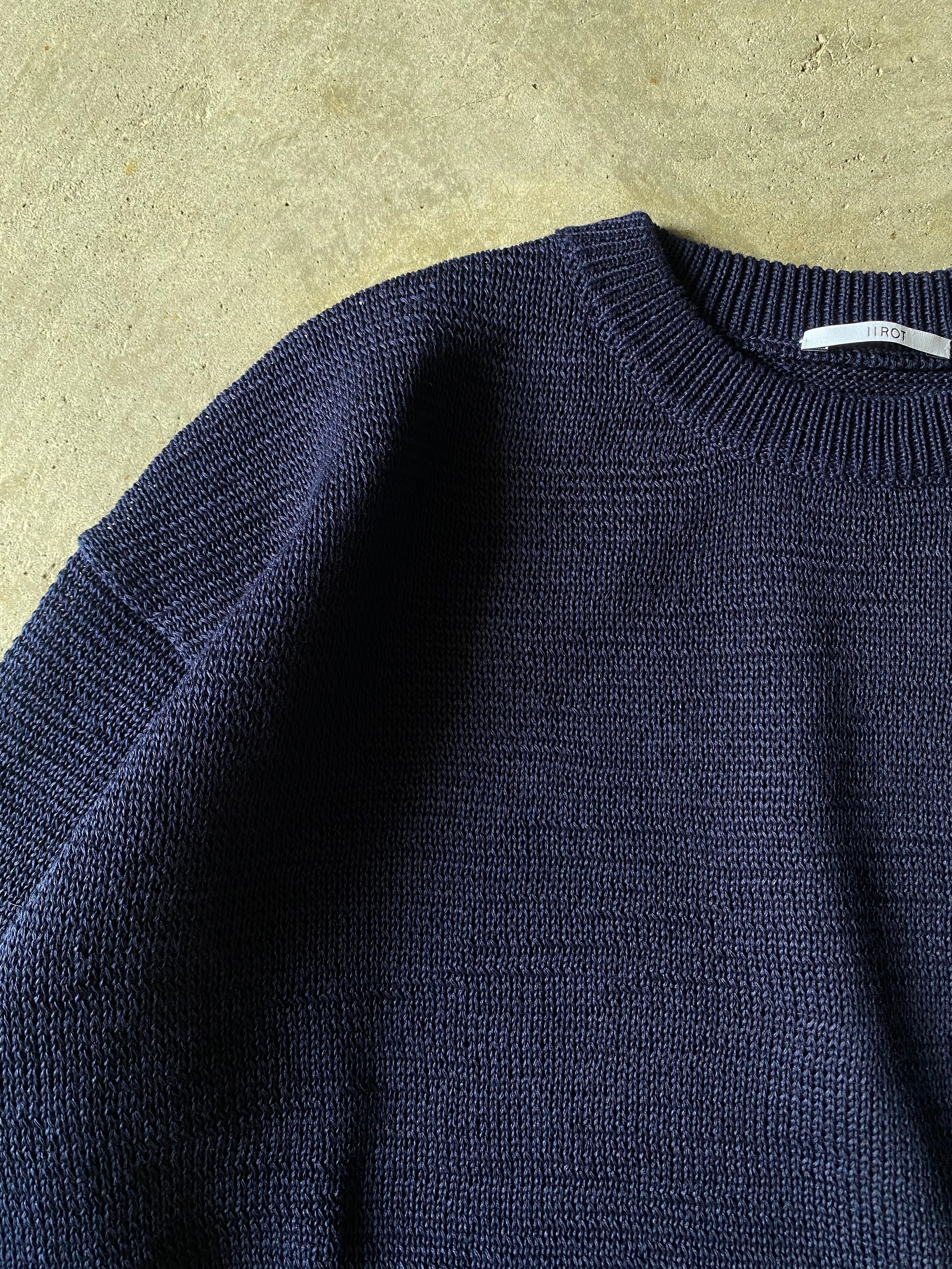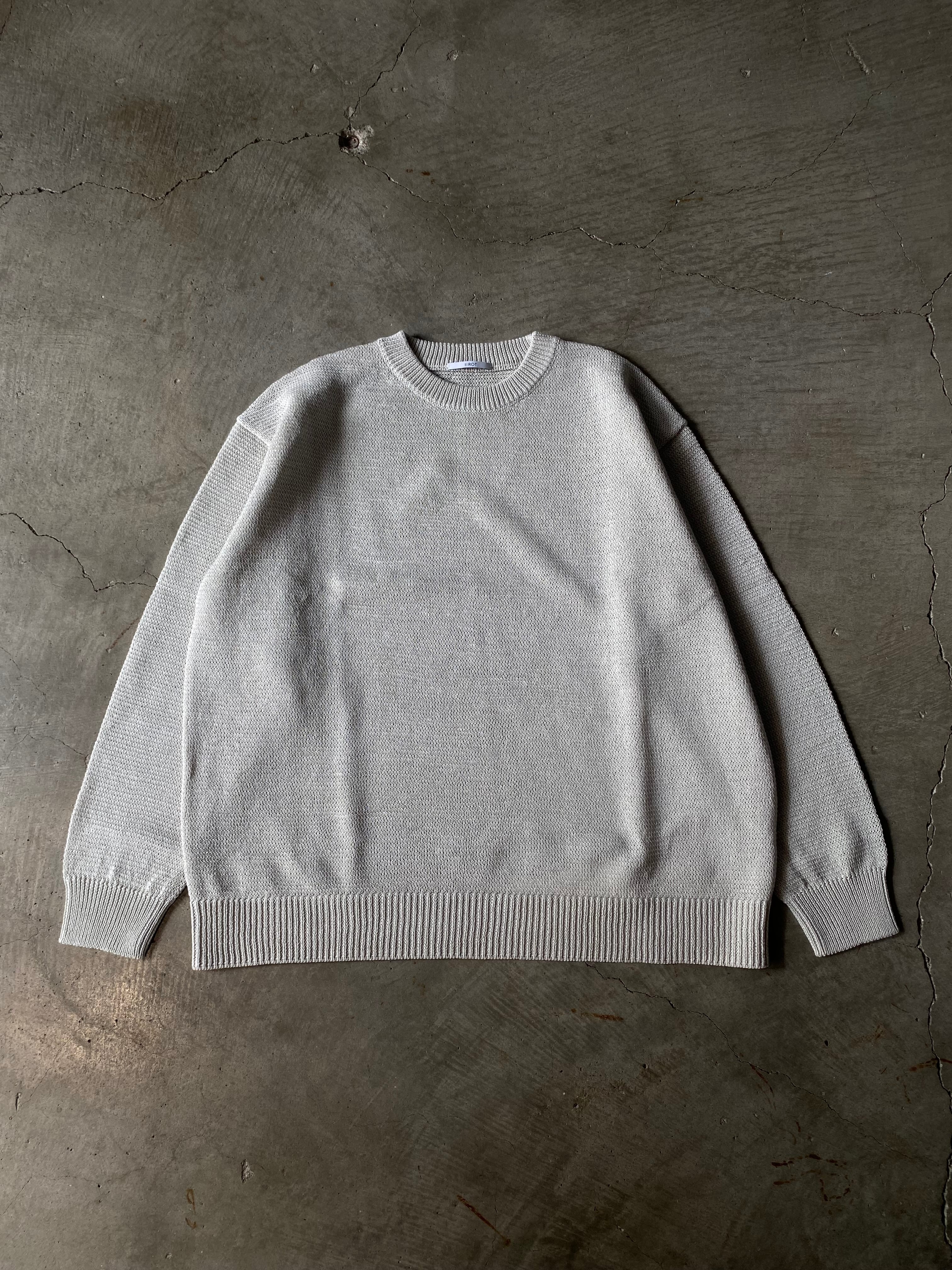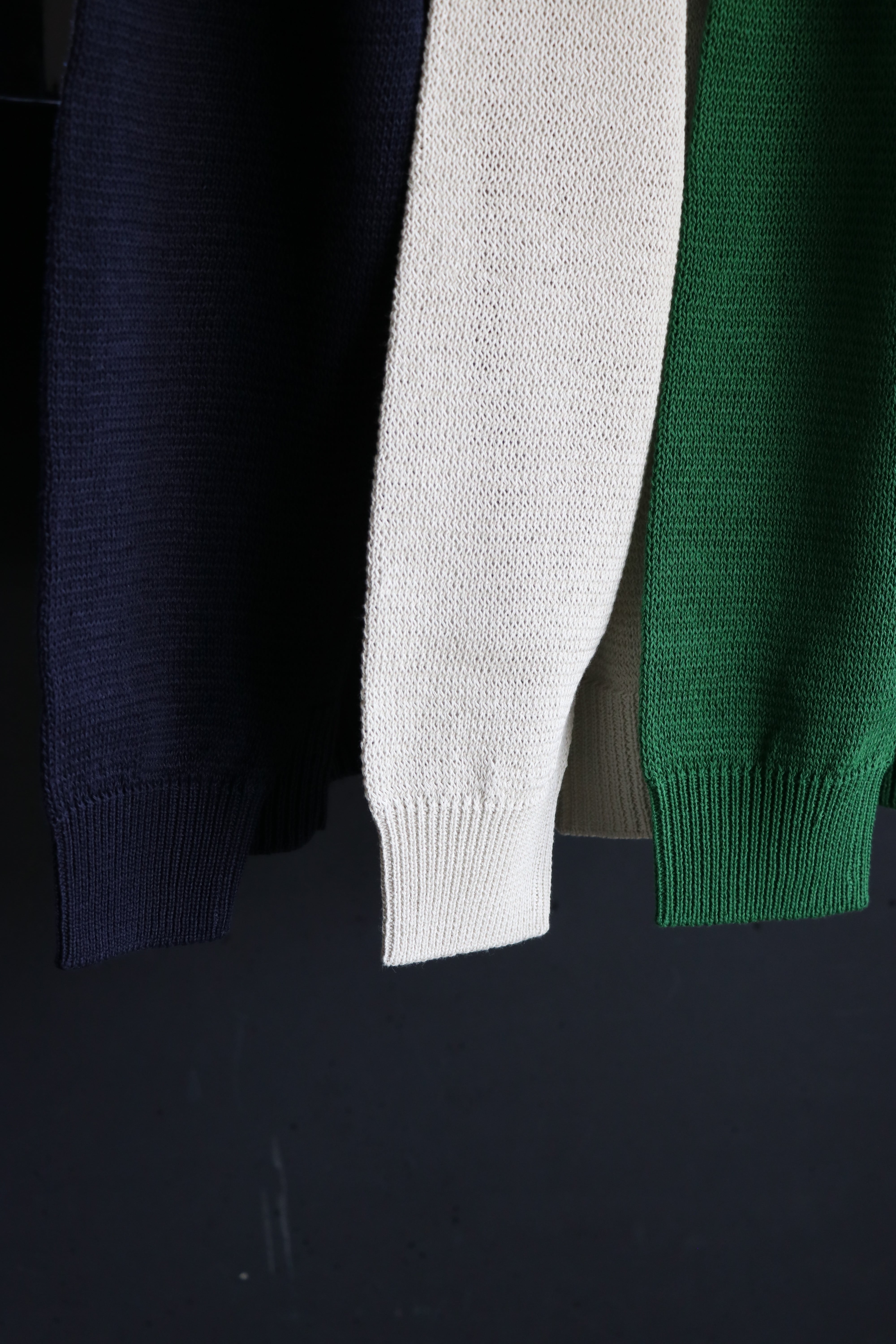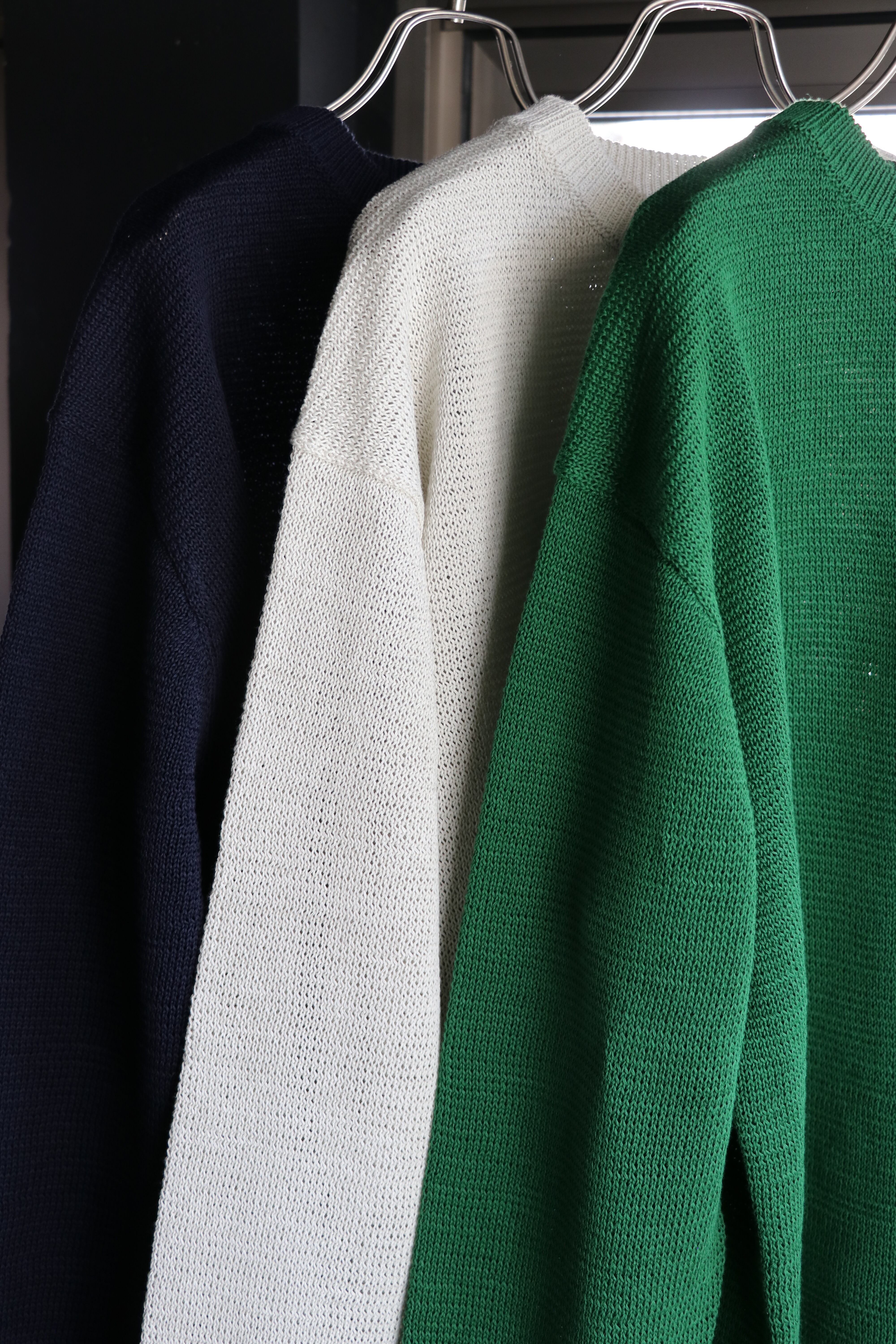 綿100%でありながら、麻のようなシャリみのあるドライな風合いが特徴です。清涼感のあるタッチと、程よい透け感のある編み地が軽やかな立体感を生み、春夏シーズンに心地よい着用感に。素材の表情が、ミニマルなデザインの中にさりげない奥行きを添えます。