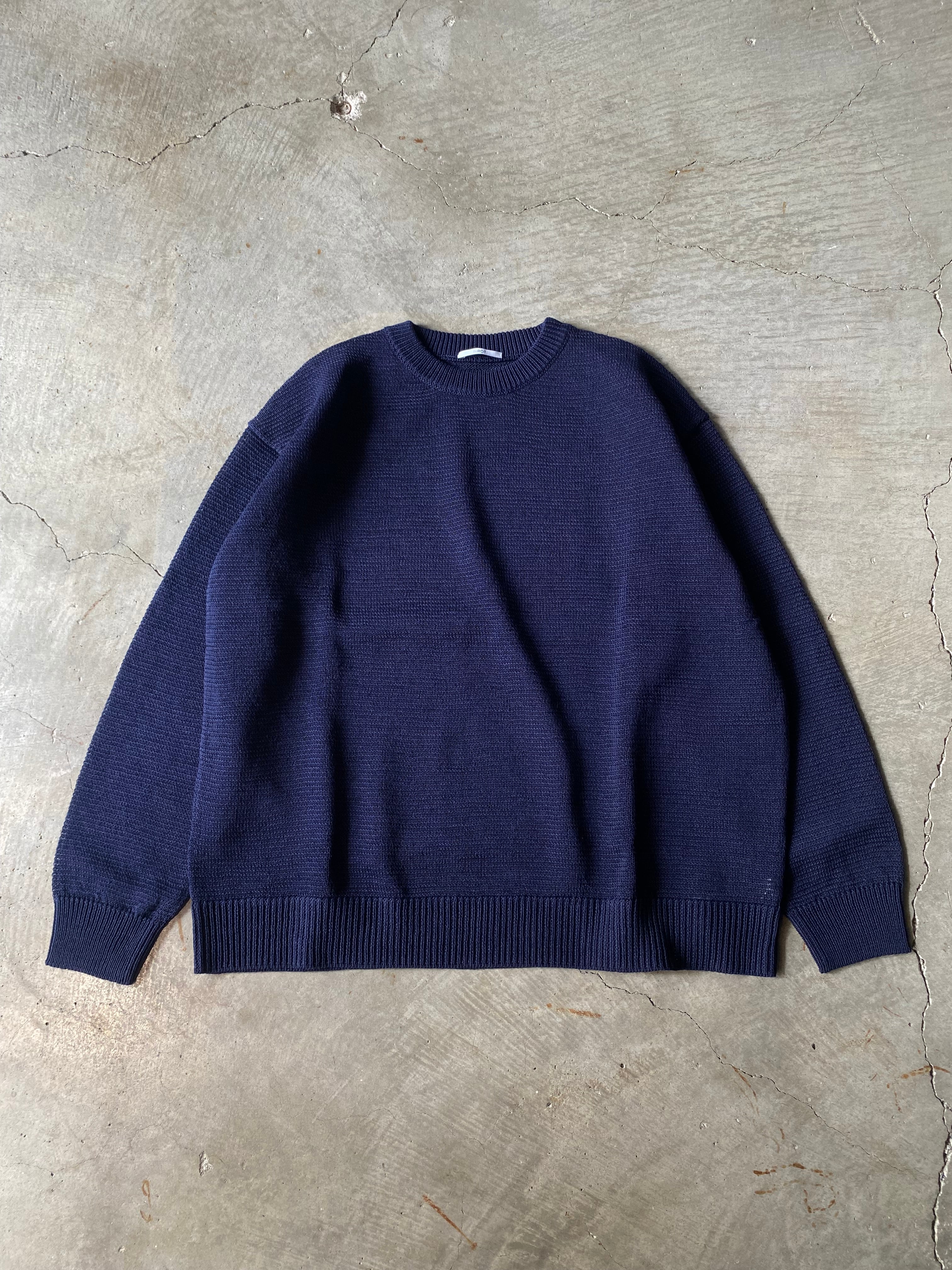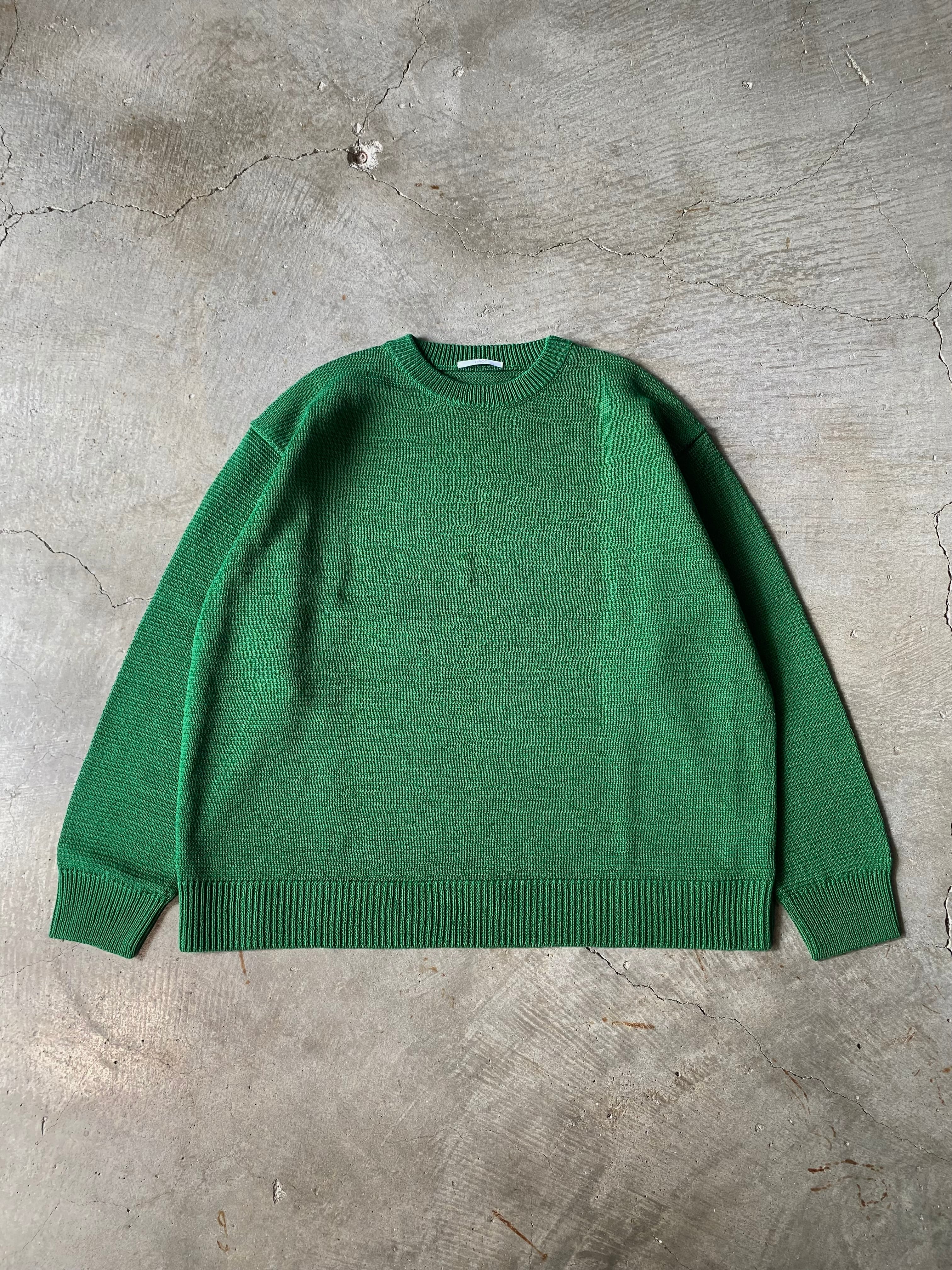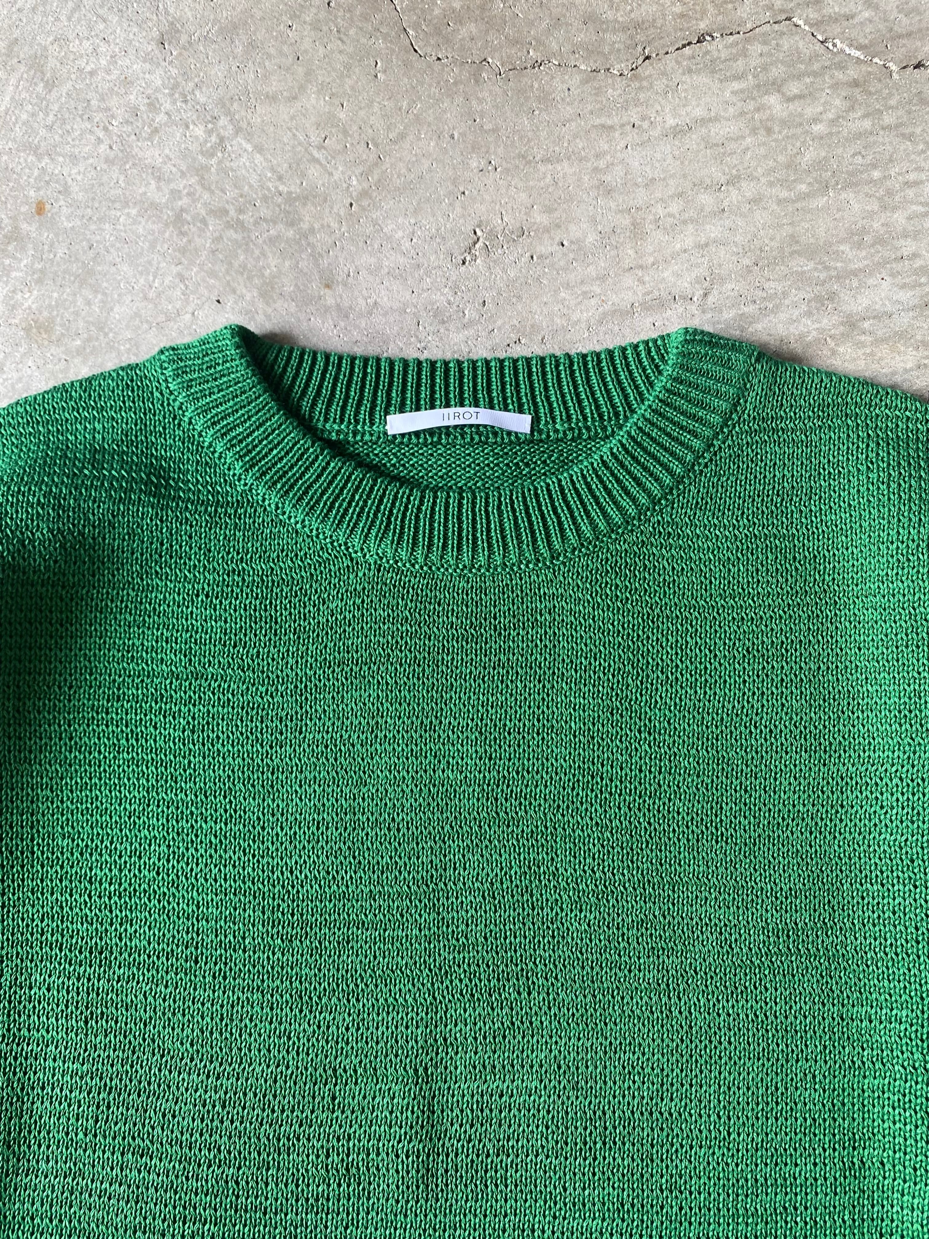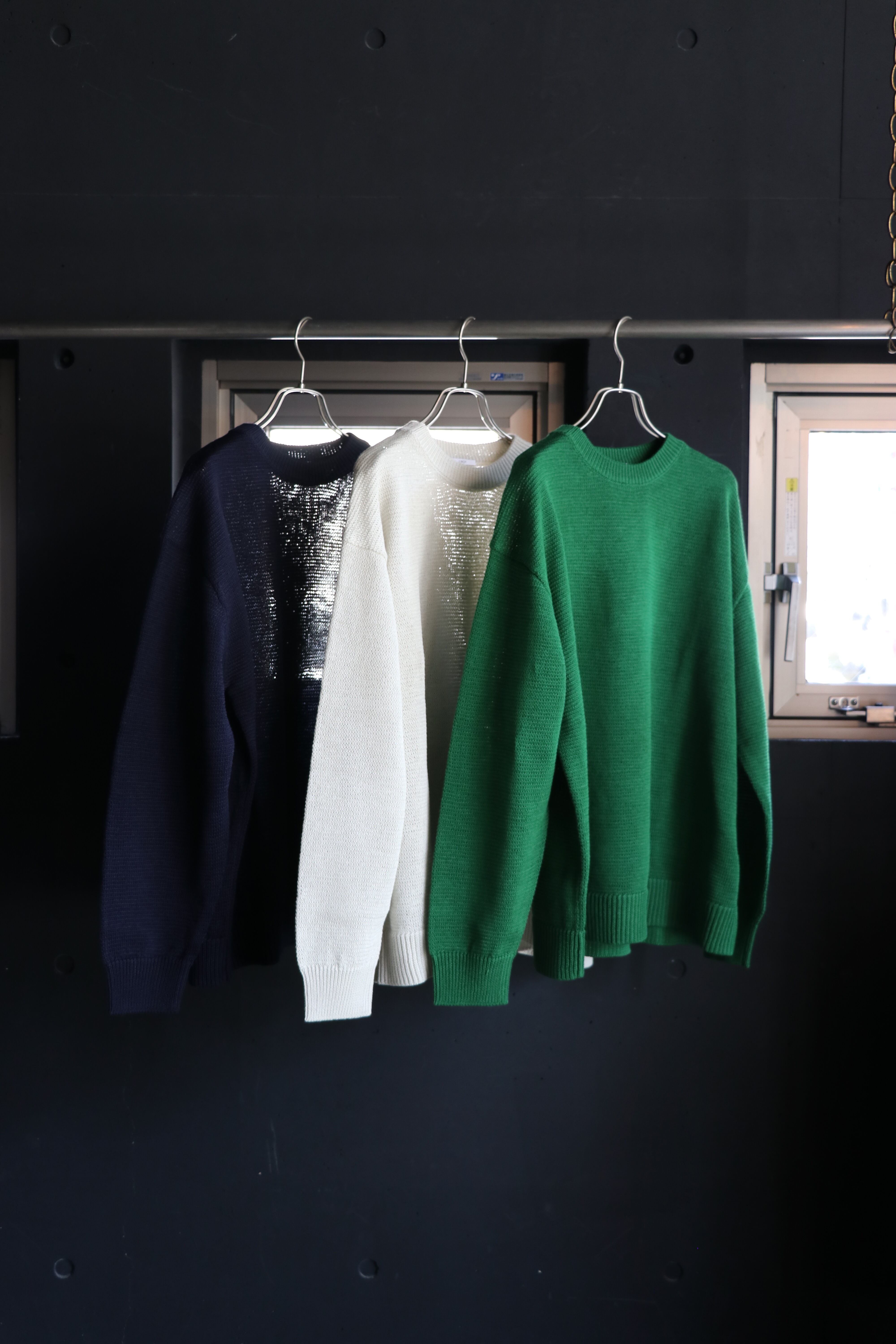 綿100%でありながら、麻のようなシャリみのあるドライな風合いが特徴です。清涼感のあるタッチと、程よい透け感のある編み地が軽やかな立体感を生み、春夏シーズンに心地よい着用感に。素材の表情が、ミニマルなデザインの中にさりげない奥行きを添えます。