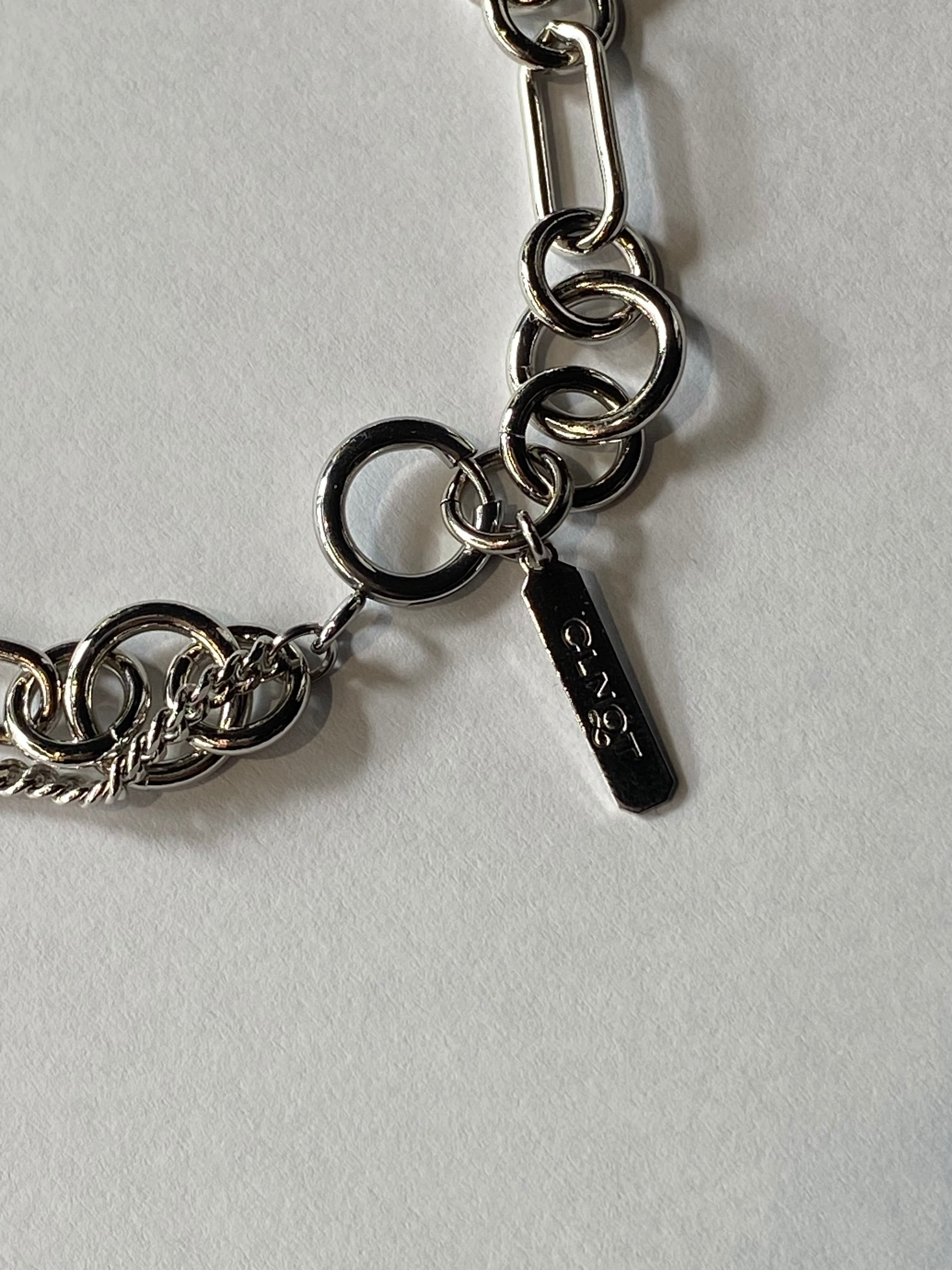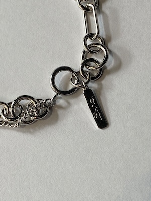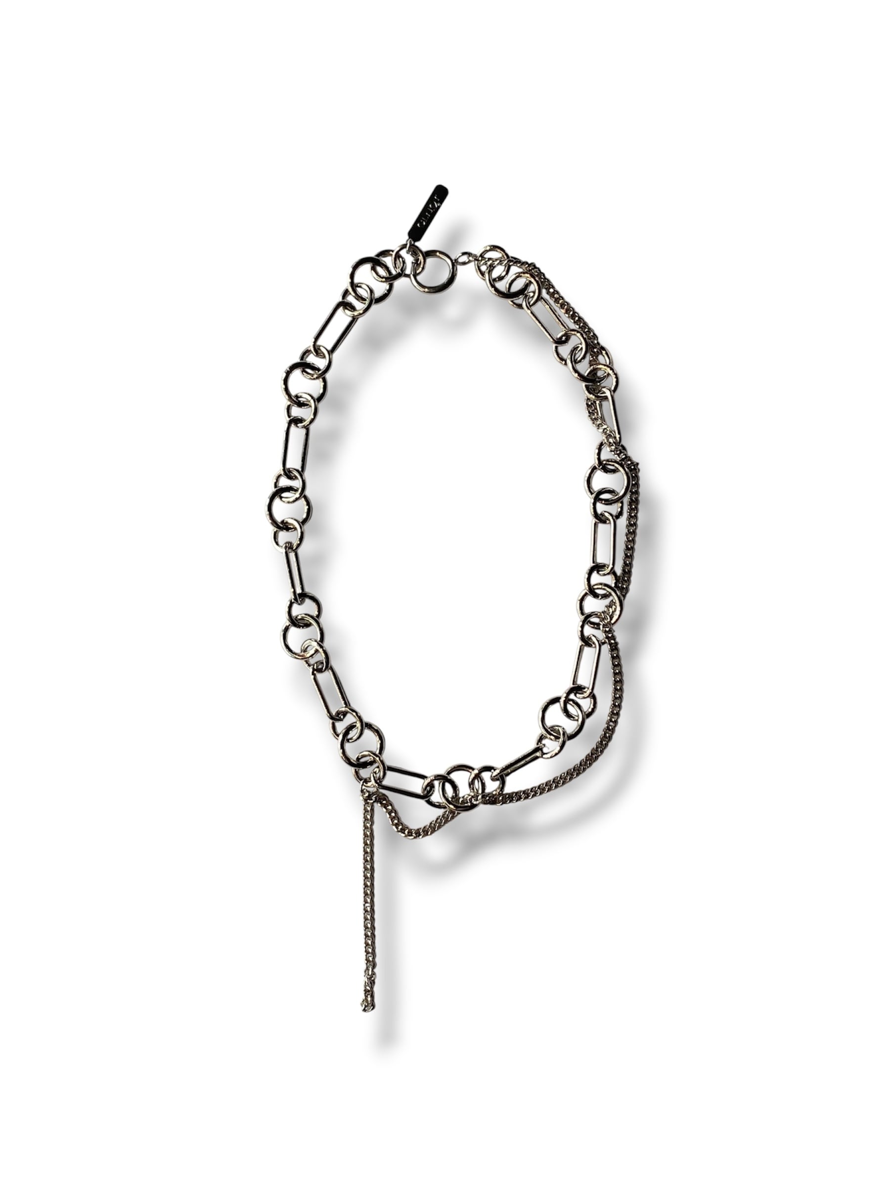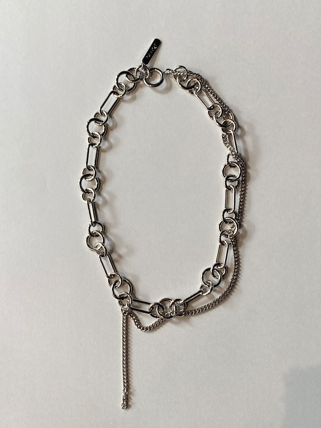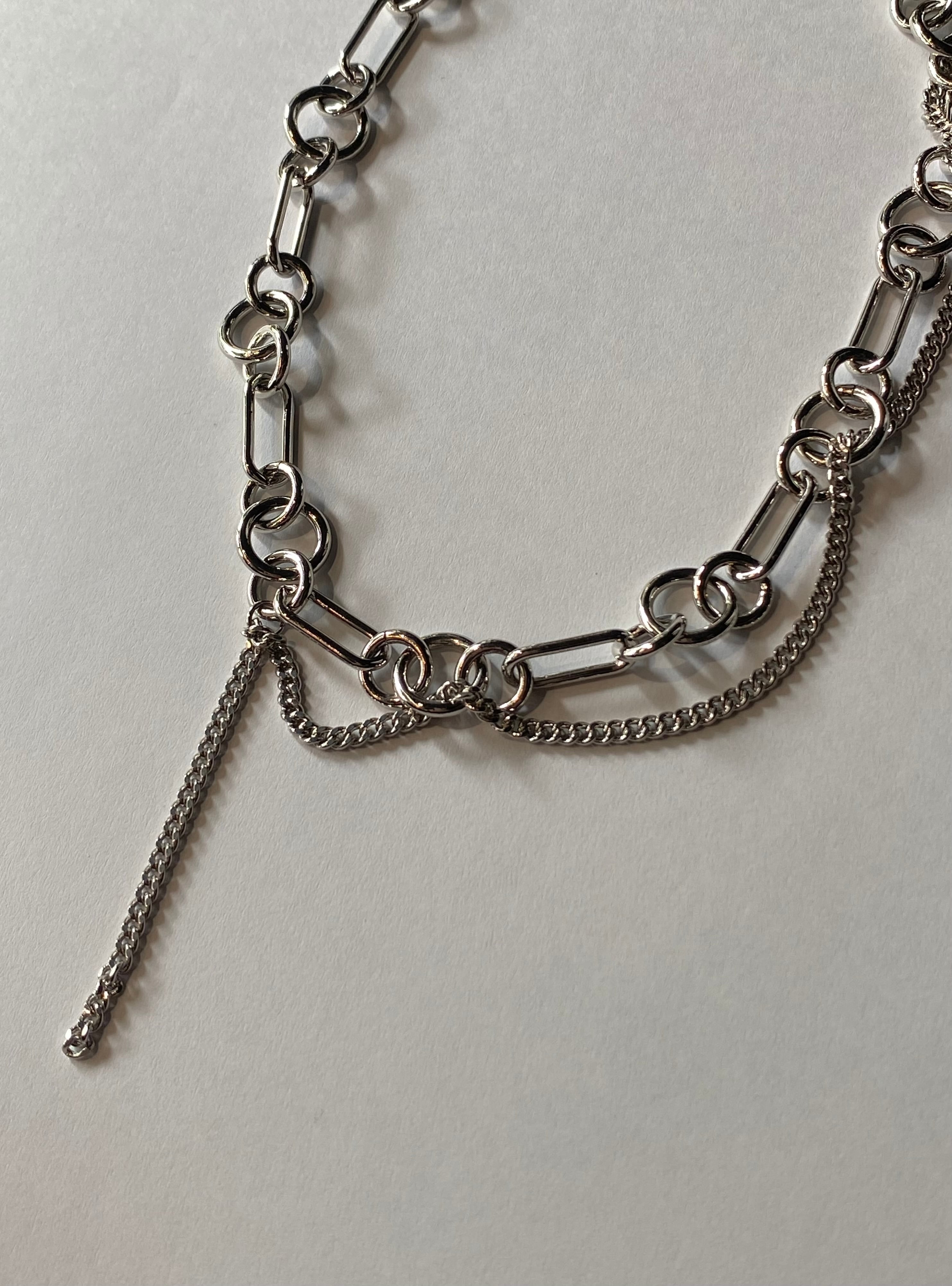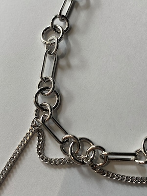 細いシルバー調のカーブチェーンに、丸形および楕円形のリンクチェーンが組み合わさっています。